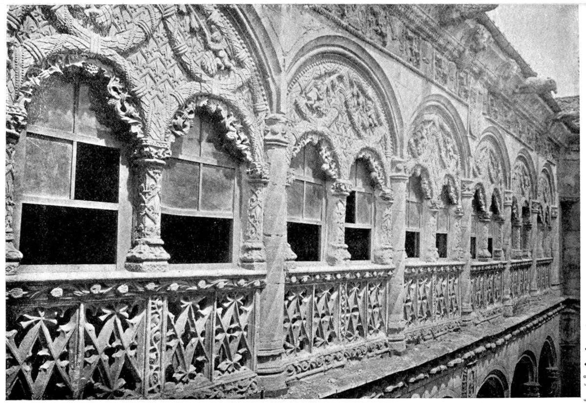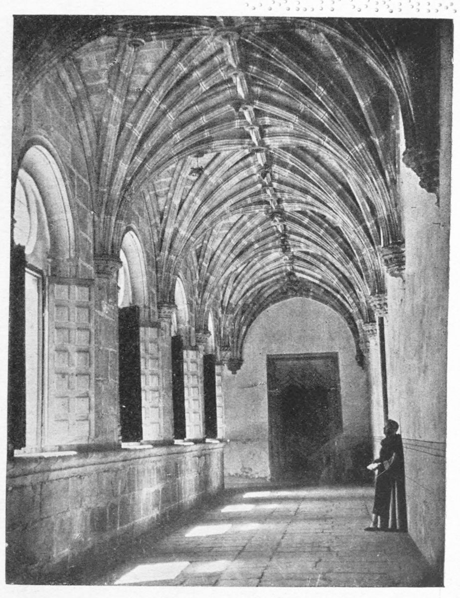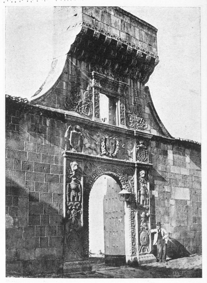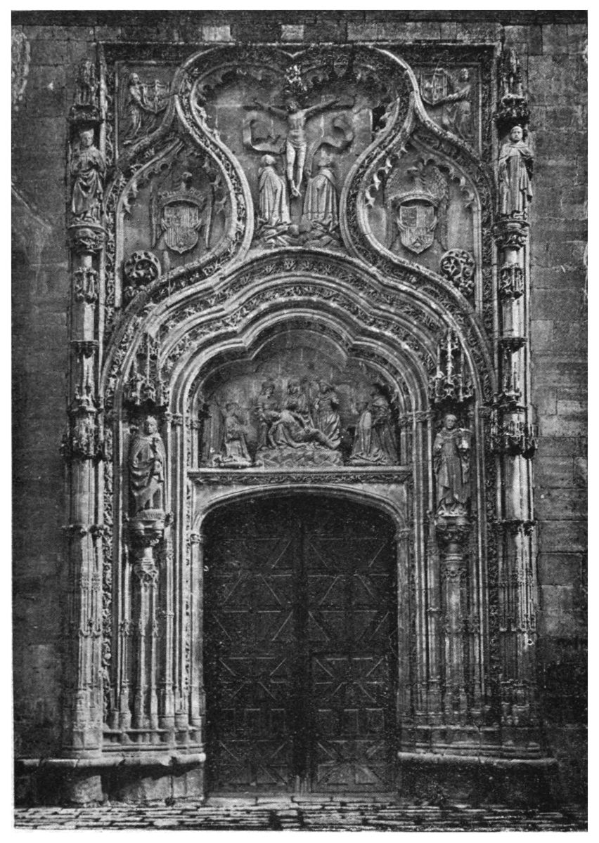 Next to San Pablo is the Colegio San Gregorio, built by Alonso de Burgos, Isabel the Catholic’s Confessor, in remembrance of his student days at the former establishment. The work, elaborate as it is, occupied only eight years—1488 to 1496.{30} The architect, Matias Carpintero, for some unknown reason committed suicide before its completion in 1490. The façade of the main entrance resembles that of the older foundation. The design displays more originality, but the execution is by no means as good. The lintel and jambs of the square doorway are decorated by a relieved pattern of fleur-de-lys, and enclosed within an arched canopy of fanciful outline. On either side of the doorway are statues of wild men—possibly an allusion to the discovery of America—and over the lintel a relief represents the founder kneeling before the patron saint. From the canopy, twisted tapering pillars soar upwards and divide the upper stage into three parts. The middle one is occupied by the relief of a pomegranate tree springing from a basin, and sheltering children and birds among its branches; it supports the coat-of-arms of Ferdinand and Isabel. The lateral divisions contain figures supporting escutcheons, the whole being ‘even more extremely heraldic in its decorations’ than San Pablo. The open-work, cusping at the top, looks as if made of coarse wicker-work, and is happily fast disappearing under the corrosive effects of frost and rain. The interior of San Gregorio wearies the eye with its excess of{31} heraldic decoration. The inner court, notwithstanding, is noble and spacious, with a double gallery of six arches on each side springing from spirally-fluted columns. The fleur-de-lys appear on the arms of the founder; the yoke and sheaf of arrows are the well-known devices of the Catholic kings. The chapel was stripped by the French of all of value that it contained, including the sepulchral effigy of Alonso de Burgos. The college is now one of the municipal buildings.