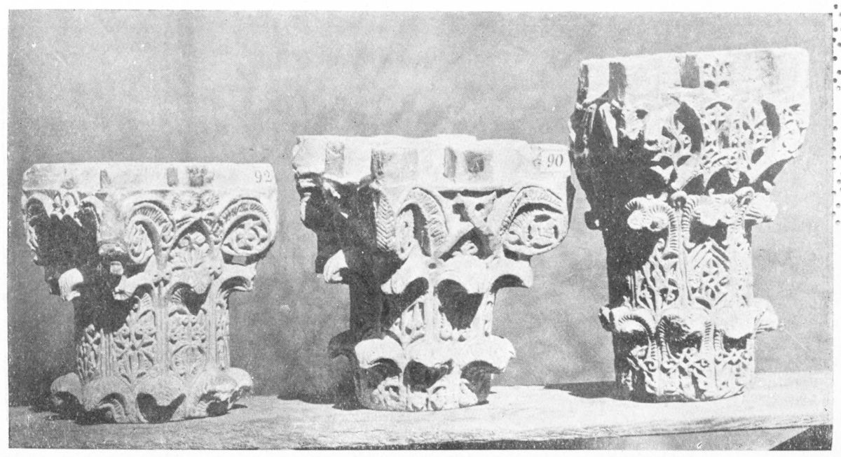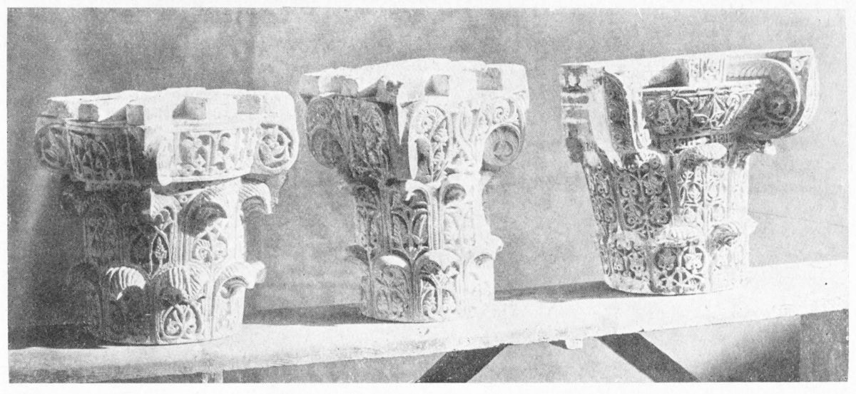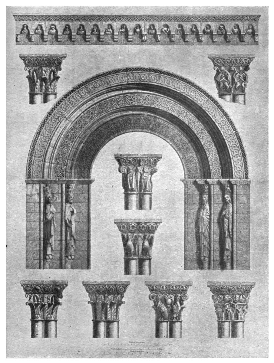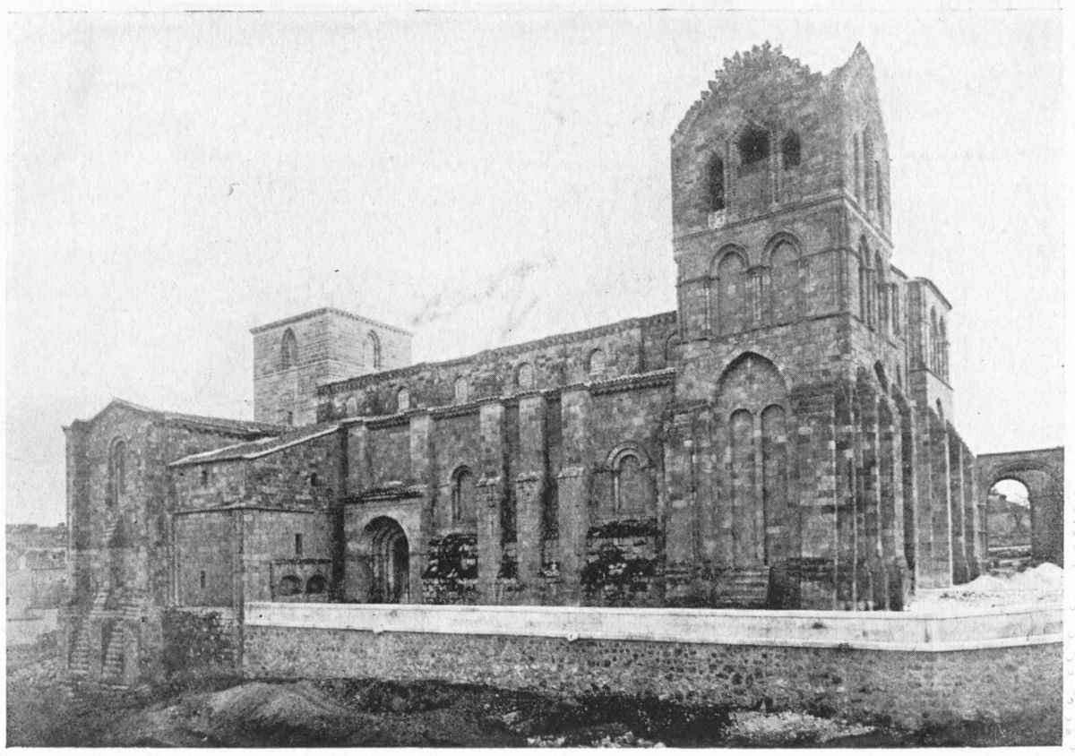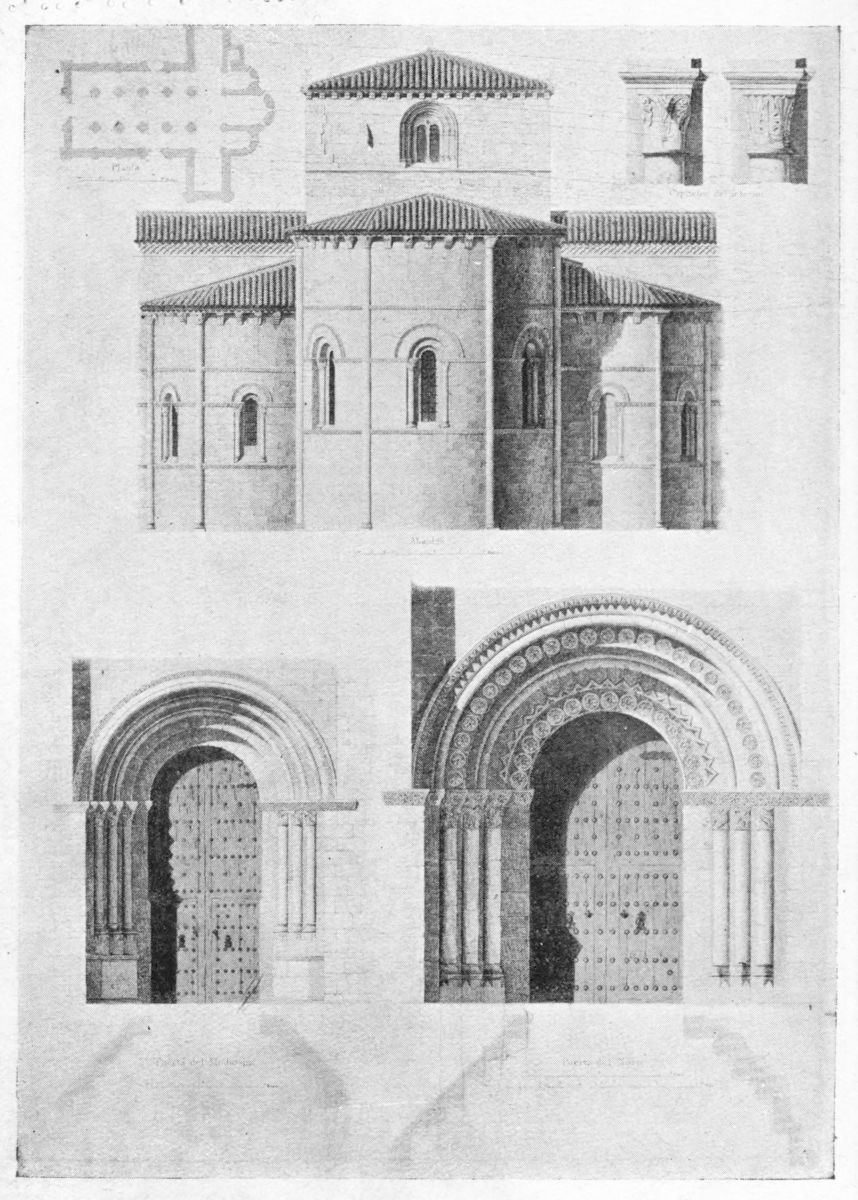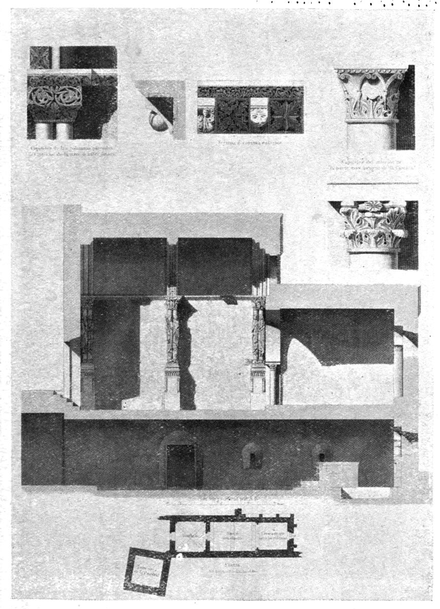 This sanctuary is now approached from the south side of the cathedral by a flight of twenty-two steps, built in the sixteenth century. We reach first the chapel, or ante-cámara, restored if not entirely constructed in the reign of Alfonso VI. (1072-1109), and representing the highest pitch of development reached at that time by Romanesque art in Spain. The roof is groined, and supported on each side by six columns built into the wall. Each column consists of two pilasters, rising from high pedestal bases, and supporting the statues of two Apostles. These figures are expressive, though rude, and the draperies are graceful and natural. At their feet are fantastic animals. The capitals of the columns are richly and beautifully carved with foliage, and with compositions representing scenes from the life of the Saviour and combats between men and lions. The capitals of the small pillars at the corners of the pedestals are also curious and delicately carved. Over the door are three heads in relief, of Christ, the Virgin, and St. John, early Romanesque work once painted and then disfigured by whitewash. The pavement of hard argamasa, or tessellated work, resembles, as Ford{45} remarks, Norman-Byzantine works in Sicily. Beneath is a crypt, or lower chapel, dedicated to St. Leocadia.