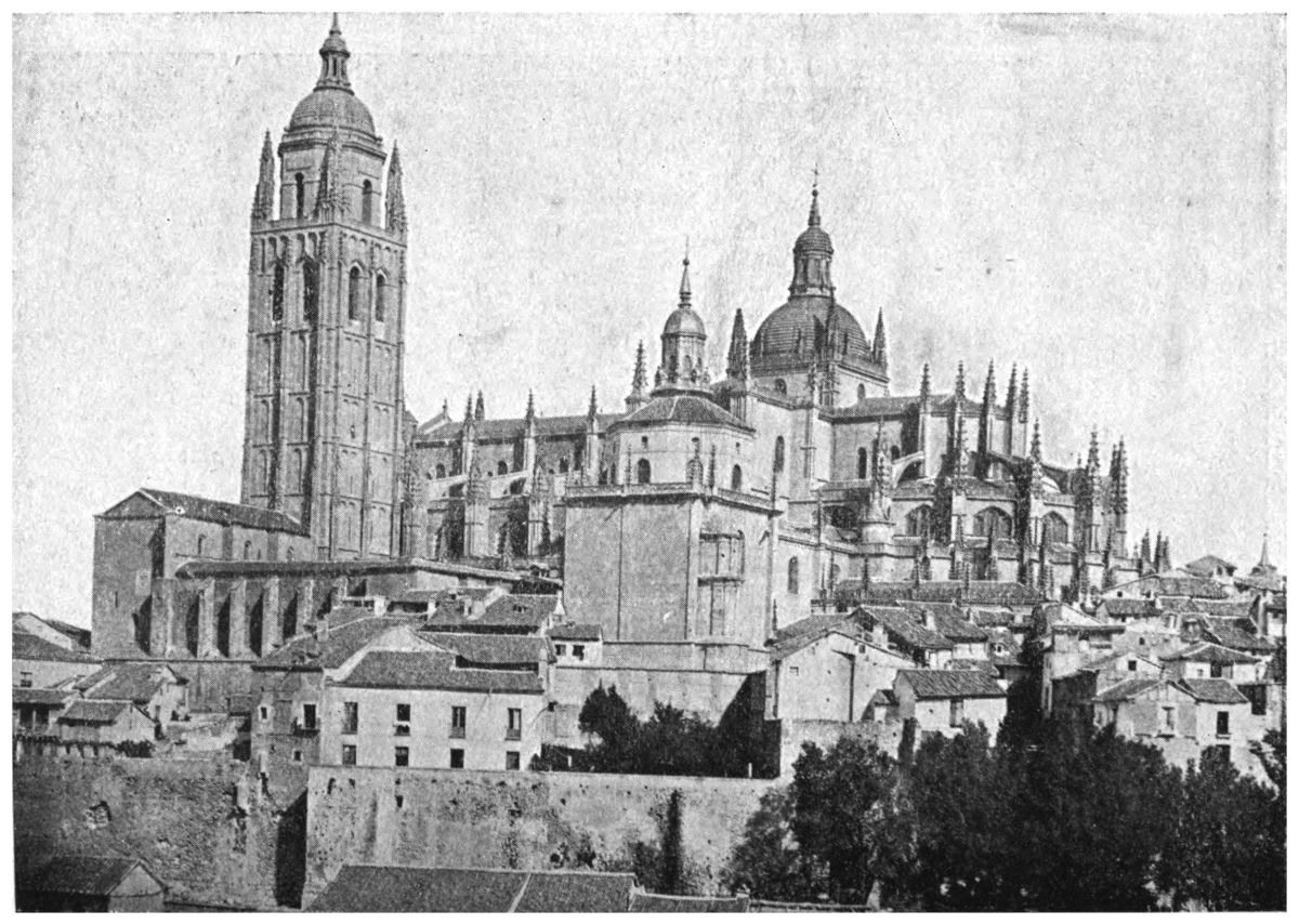 The Iglesia Mayor is said to have been built at the same time as the church of Santa Maria la Antigua, on the other side of the square, and both by Count Ansúrez. Comparing conflicting testimony, and the opinions of various architects, the conclusion would appear to be that the church was founded before the Count’s time (for it is mentioned in documents as far back as 1088, and was in his day called the Ancient), and that the existing fabric dates mainly from the reign of Alfonso IX. (1230-44)—not from the{25} time of the alleged restorer, Alfonso XI. Santa Maria is, beyond doubt, the most interesting church in the city. Its lofty steeple, with tiled roof and semicircular windows in all its four stages, is one of the few prominent landmarks of the wayfarer to Valladolid. The side apses are Romanesque, but the nave terminates in an apse, Gothic in style, and pierced with lancet windows. The buttresses taper off into graceful finials, with crockets and gargoyles. The main apse and transept are both pierced near the roof with an elegant openwork balustrade. The steeple is thoroughly Lombard in character.