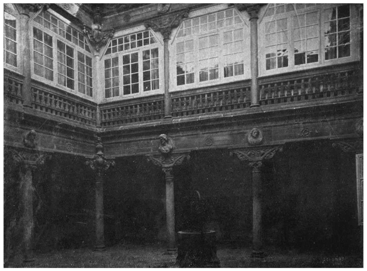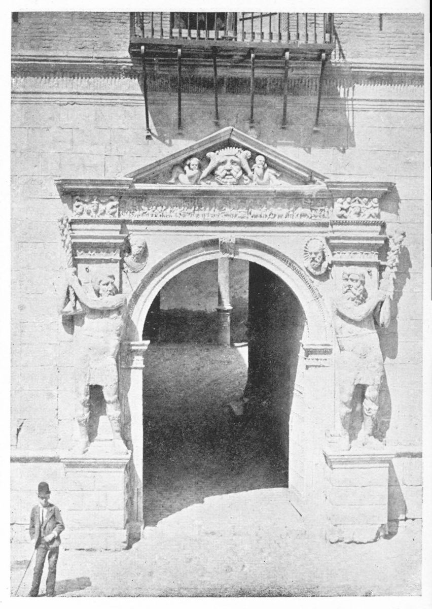 A great many of the fine old mansions (solares) of the aristocracy and merchants of Zaragoza disappeared in the siege, or to permit of modern improvements. Those which remain date mostly from the sixteenth century. The finest, on the whole, is the Casa de la Infanta, so-called as having been the residence of La Vallabriga, a lady banished from Madrid for marrying the{158} Infante Don Luis. The house was built by a rich merchant named Gabriel Zaporta in the middle of the sixteenth century. A square entrance admits to a court, round which runs a gallery, upheld by columns on fluted pedestals, and formed of caryatide figures interlocked. On these rest the capitals, elaborately carved with masks, and on these again is borne the gallery, the arches and parapet of which are enriched with medallions, masks, grotesques, and foliage. The decoration is a fine specimen of the plateresque style. The staircase, in the same style, is worthy of note.