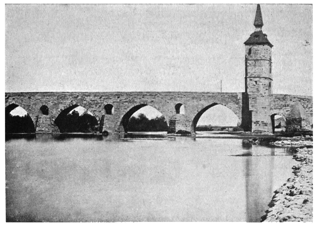 Close by, the yellow Ebro is spanned by the seven arches of the Puente de Piedra. Its origin is of unknown antiquity. It was here in 1435, when one of the arches collapsed—presaging the destruction by the Genoese of the Aragonese fleet which sailed that day; and the inscription mentioning Alfonso V., and the date 1437, can only refer to its reconstruction. And across this bridge we pass into the stern, desert country of Aragon, and so on to the distant, gleaming Pyrenees.{163}