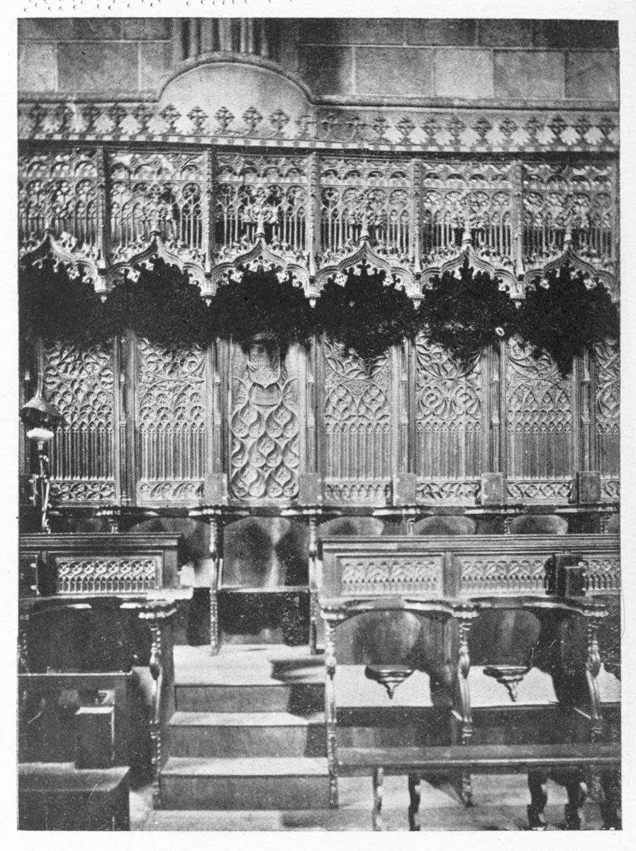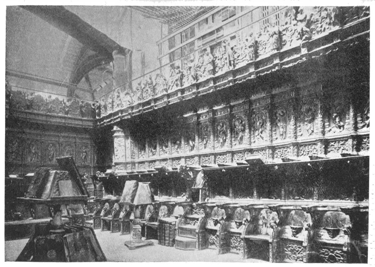 The choir stalls are richly carved with caprices and scenes, ‘ill according,’ remarks a Spanish writer, ‘with the sanctity of the place.’ But the backs of the lower seats bear representations of Biblical characters, which, like the canopies above, are exquisitely carved. The organs are Churrigueresque, and the gorgeous Gothic trascoro is in hardly better taste. The chapels date mostly from the seventeenth and eighteenth centuries, and contain nothing of interest, except the alleged body of St. Eulalia of Merida.