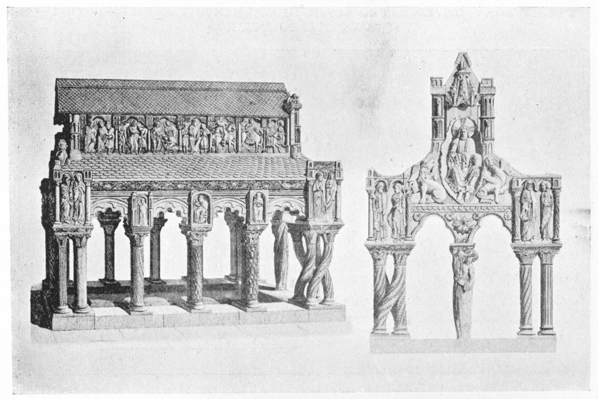 Enclosed within a railing is the Arca, a chest of oak, 7½ feet long by 3¾ broad, and thinly plated with silver. A Latin inscription of four lines on the lid goes to prove that this was the work, not of Alfonso the Chaste, but of Alfonso VI., a conclusion warranted also by the Arabic inscription in Kufic characters, in praise of the Most High, running round the chest—a form of decoration not introduced into Christian work till after the fall of Toledo. On one face of the ark are reliefs of the Twelve Apostles within niches, with the Four Evangelists at the angles, and the figure of Christ, supported by angels, in the middle. On one side are reliefs of the Nativity, Adoration of the Shepherds, and the Flight into Egypt; on the other the Revolt of Satan, the Ascension, and the Apostles. The subject of the reliefs on the cover is the Crucifixion.{46}