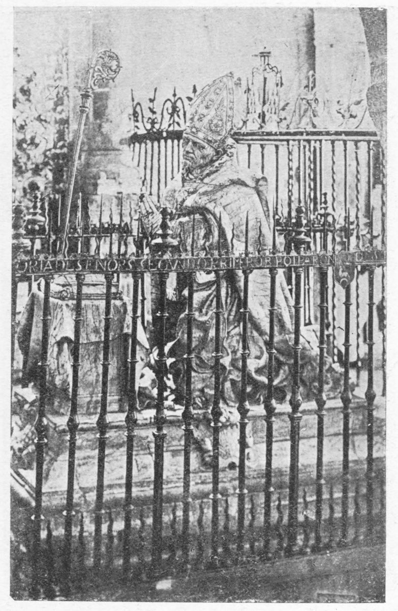 The Gothic church of San Francisco, now attached to a hospital, was founded by Fray Pedro, a companion of the great Francis of Assisi himself. This is the burying-place of the great family of Quirós, which claimed, in a not very reverent distich, to rank in point of dignity and antiquity next to the Divinity (‘Después de Dios, la casa de Quirós’). In the chancel lies Gonzalo Bernaldo de Quirós the Older, the youthful friend of Enrique of Trastamara, who died, wearing the religious habit, in 1575. Within a sepulchre upheld by lions which{53} bear escutcheons crossed by the bar sinister, are the ashes of another Gonzalo Bernaldo, a distinguished illegitimate scion of the house. He is shown clad in armour, and at his feet a dog—symbolical, possibly, of the fidelity and tenacity with which he watched over the interests of his family during the minority of its chiefs. Close by is the vault of the house of Valdecarzana; a modern inscription informs us that during the interment of one of that family, a live cow must be present in the church—why or wherefore not being stated.