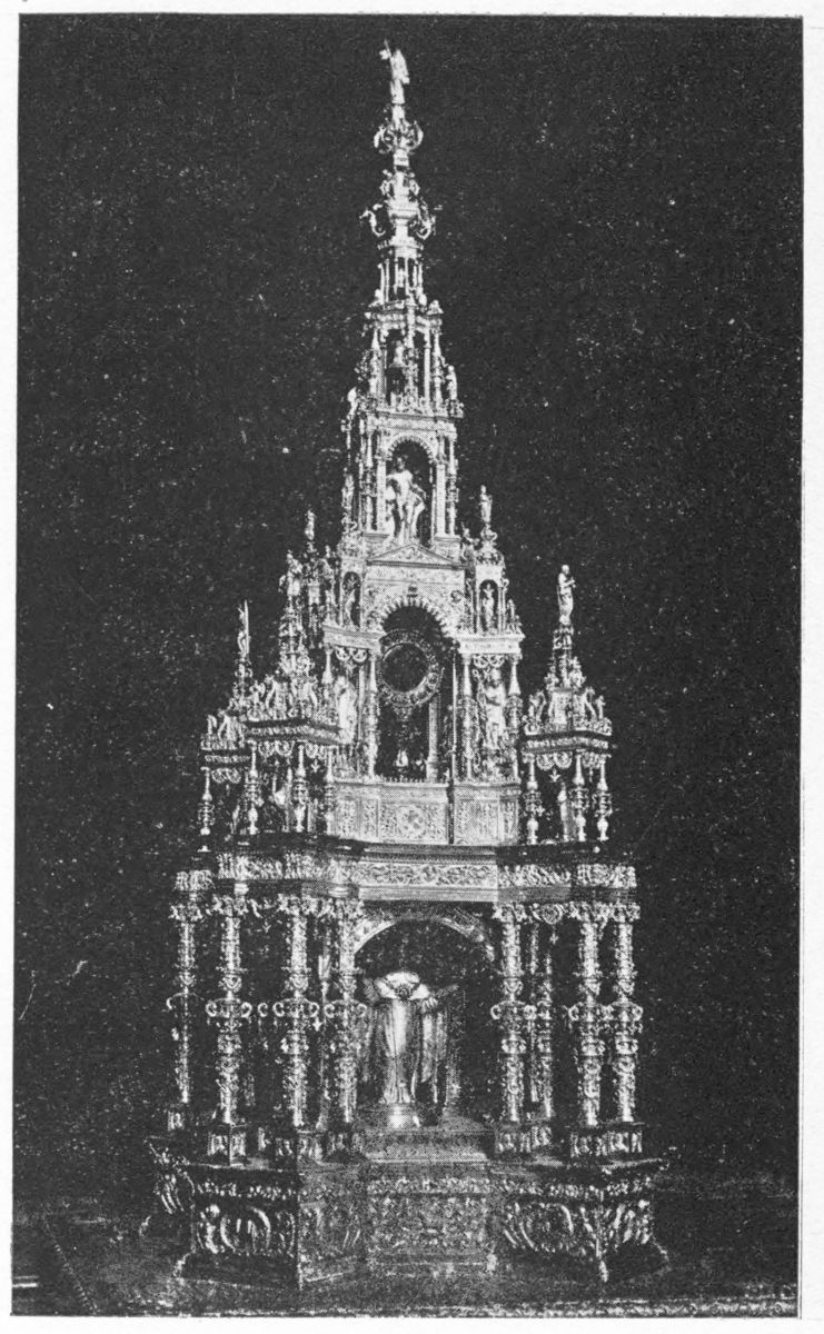 In the sacristy is one of the finest specimens of the metal-work for which Spain has always been renowned. The solid silver monstrance, by Juan de Arfe, is 6½ feet high, and weighs upwards of 150 lbs. It is in the shape of a temple in four stories, two of which are octagonal, and two circular. Statuettes of Adam and Eve, and a{24} relief of the mystery of the Conception, adorn this exquisite work, for which the artificer received 44,000 reals.