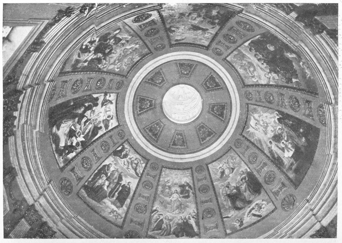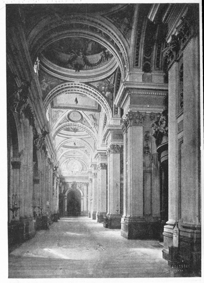 The interior is not wanting in majesty and massiveness. Only the nave, with its aisles and chapels, has been completed. The huge piers carry bold arches, separated by a broad cornice from a plastered and panelled groined ceiling. The walls are destitute of ornament, but over the arched entrances to the chapels runs an open gallery with balustrades. The aisles have been obstructed by ‘provisional chapels,’ which{23} Herrera would have indignantly swept away; and the choir, which he intended to place behind the High Altar, is now placed so as to block the best view of the nave. The Capilla Mayor, placed in the crossing, is in bad taste, with innumerable doors and tribunes piercing its walls. One cannot but agree with the Spanish writer who says that nothing is wanting to destroy the impression of ‘a grand whole,’ which Herrera was especially anxious to create.