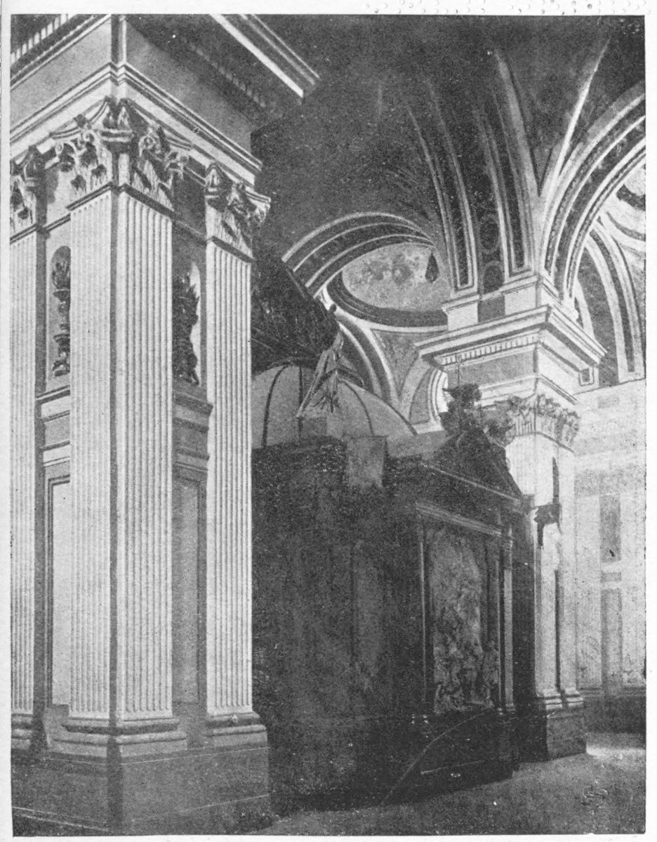 The only objects of particular interest in this vast edifice are those just named, which stand back to back. The Shrine or Capilla Santa constitutes a chapel within a chapel, the exterior being rectangular, the interior elliptical. Overhead is an oval dome borne on four Corinthian columns, with capitals richly gilded, and over this again another cupola or lantern painted by a namesake (not a relative) of Velazquez. There are four smaller domes painted by Goya and Bayeu. The profusion of rich marbles, the elaboration of the architecture, the brilliancy of the frescoes, and the multitude of statues give this chapel a sumptuous and not inartistic appearance. Around are hung banners taken from the infidels. The Sacred Pillar is almost entirely concealed, but there is a hole in the casing through which the devout may kiss it. On each side of the chapel imposing staircases lead to the crypt, in which lie several archbishops and canons, and the heart of Don Juan José of Austria, brother of Carlos II.