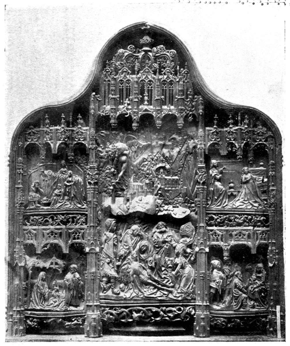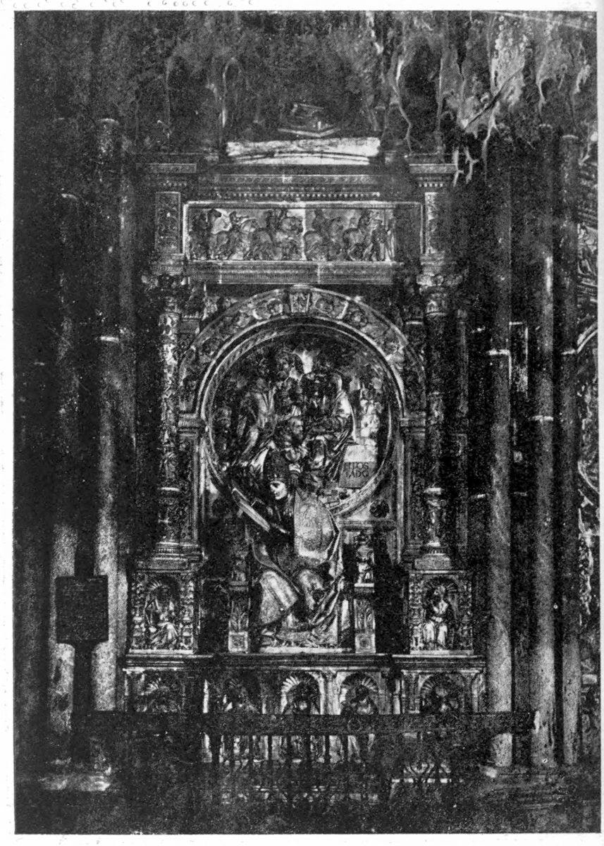 The High Altar of the cathedral is of alabaster and in the Gothic style, the work of one Damian Forment, an early sixteenth-century artist. The lower reliefs, separated by slender pilasters, represent the Espousals of the Virgin, the Annunciation, the Visitation, the Nativity, the Adoration of the Magi, the Crucifixion, and the Resurrection. Above, in canopied niches, are the Assumption, the Nativity, and the Presentation. The canopies are richly adorned with the figures of saints. At the sides are two large statues of St. James and St. Braulio—objects of special devotion—and at the apex of the altar-screen are two angels supporting Our Lady of the Pillar. The whole is undoubtedly the finest work of art in the cathedral.