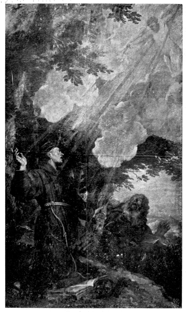 The genius of Juan de Juni, who was living at Valladolid in 1570, is best represented by his wooden statue of the Dead Christ, from the convent of San Francisco. So ghastly is the realism of this figure, that looking at the rigid limbs—more like those of a gladiator than of the Crucified—we feel that corruption is about to take place, and avert our eyes in horror. One is tempted to hold one’s nose, as Murillo is said to have done while contemplating a canvas by Valdes Leal. Not less vigorous and infinitely more attractive is the noble statue of St. Bruno by the same sculptor.