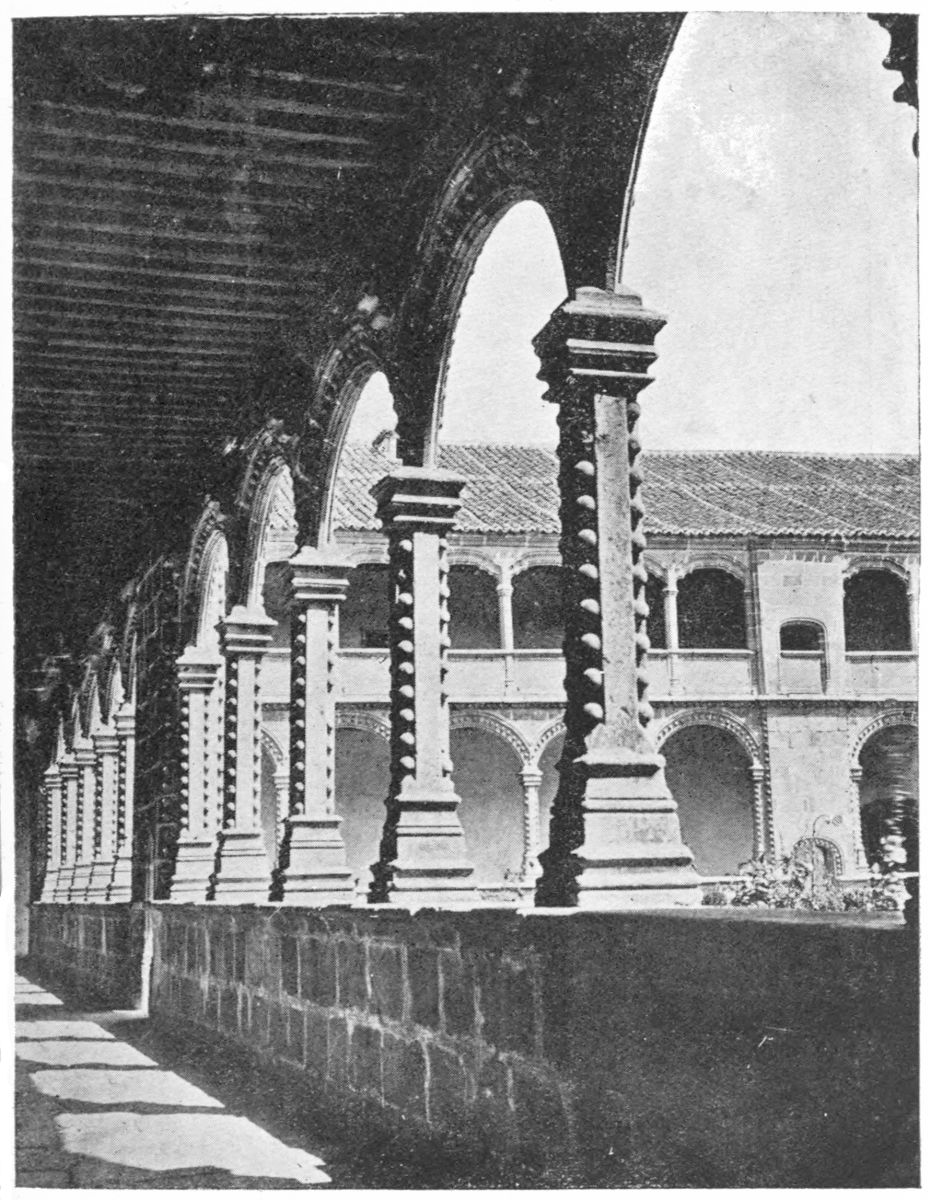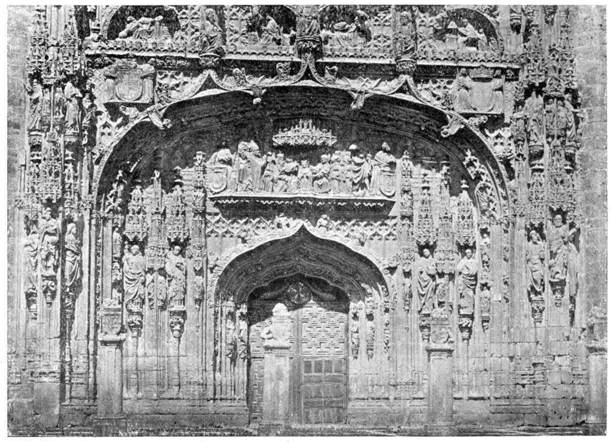 Next to San Pablo is the Colegio San Gregorio, built by Alonso de Burgos, Isabel the Catholic’s Confessor, in remembrance of his student days at the former establishment. The work, elaborate as it is, occupied only eight years—1488 to 1496.{30} The architect, Matias Carpintero, for some unknown reason committed suicide before its completion in 1490. The façade of the main entrance resembles that of the older foundation. The design displays more originality, but the execution is by no means as good. The lintel and jambs of the square doorway are decorated by a relieved pattern of fleur-de-lys, and enclosed within an arched canopy of fanciful outline. On either side of the doorway are statues of wild men—possibly an allusion to the discovery of America—and over the lintel a relief represents the founder kneeling before the patron saint. From the canopy, twisted tapering pillars soar upwards and divide the upper stage into three parts. The middle one is occupied by the relief of a pomegranate tree springing from a basin, and sheltering children and birds among its branches; it supports the coat-of-arms of Ferdinand and Isabel. The lateral divisions contain figures supporting escutcheons, the whole being ‘even more extremely heraldic in its decorations’ than San Pablo. The open-work, cusping at the top, looks as if made of coarse wicker-work, and is happily fast disappearing under the corrosive effects of frost and rain. The interior of San Gregorio wearies the eye with its excess of{31} heraldic decoration. The inner court, notwithstanding, is noble and spacious, with a double gallery of six arches on each side springing from spirally-fluted columns. The fleur-de-lys appear on the arms of the founder; the yoke and sheaf of arrows are the well-known devices of the Catholic kings. The chapel was stripped by the French of all of value that it contained, including the sepulchral effigy of Alonso de Burgos. The college is now one of the municipal buildings.