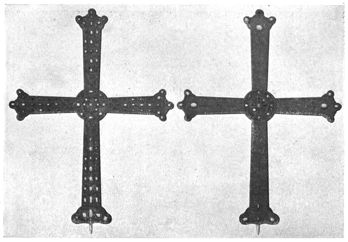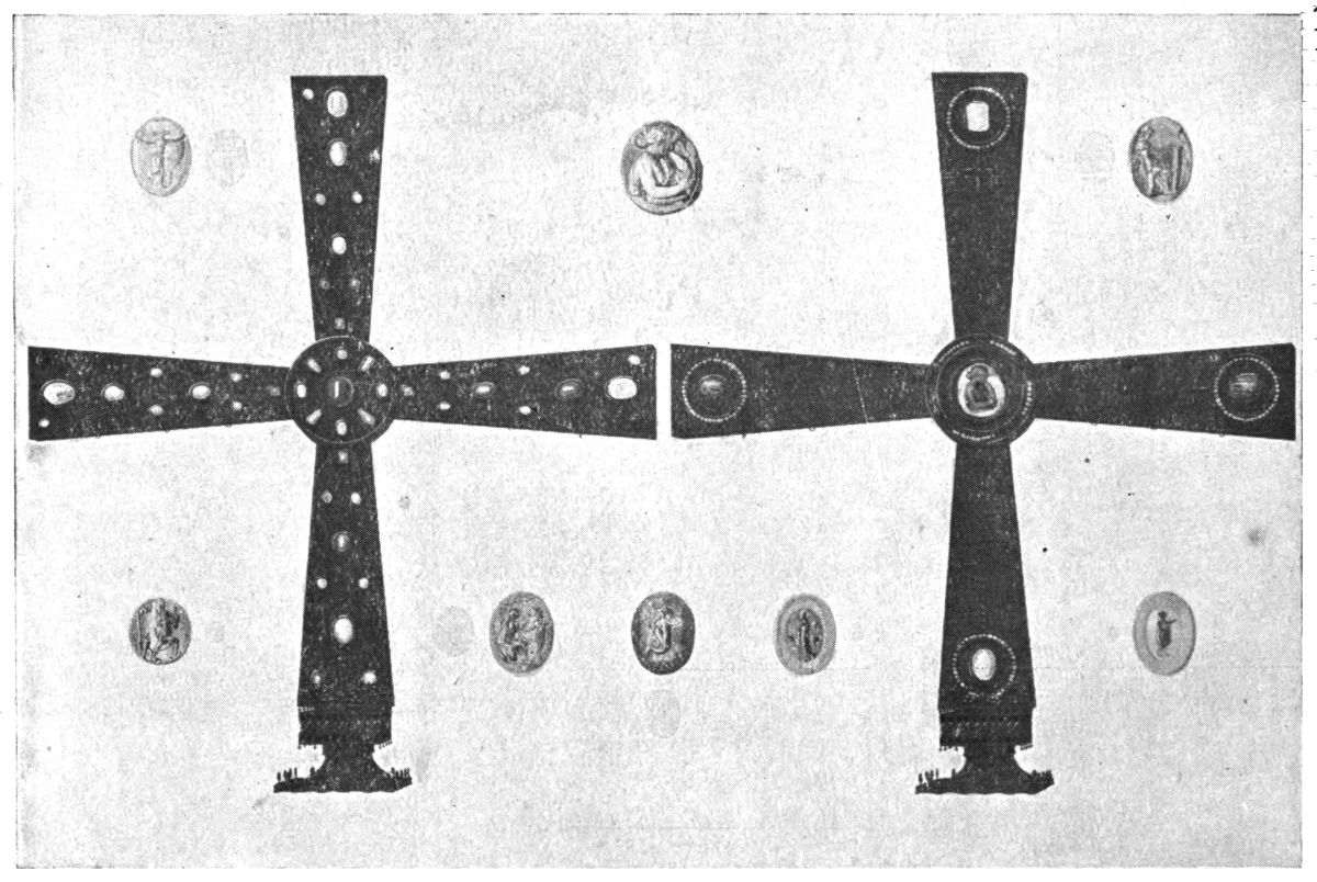 Other precious relics are exhibited in the chamber, among them the winding-sheet of the Saviour, in a superb box of gold and blue enamel. The Cruz de la Victoria was carved of plain oak and carried as a standard by Pelayo at Covadonga; it is now encrusted with gold and{47} brilliant enamels—work executed, as the inscription records, at Gauzon, near Oviedo, in the year 908. Another cross, styled the Cruz de los Angeles, dates from the times of Alfonso the Chaste, for whom it was made, it is said, by two angels disguised as goldsmiths. This precious relic is in the shape of a Maltese cross, is set with gems en cabochon, and encrusted with gilt filigree-work. In the centre is set a precious ruby. On the arms is inscribed the date of the making (808 A.D.) and an anathema on whomsoever should steal it. It is certainly remarkable that this inscription should contain nothing about the supernatural workmanship of the cross!
