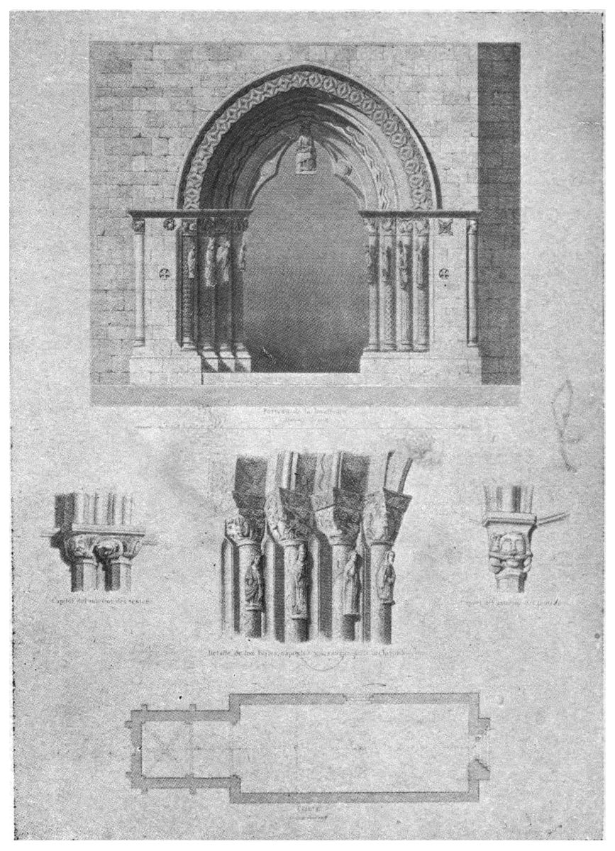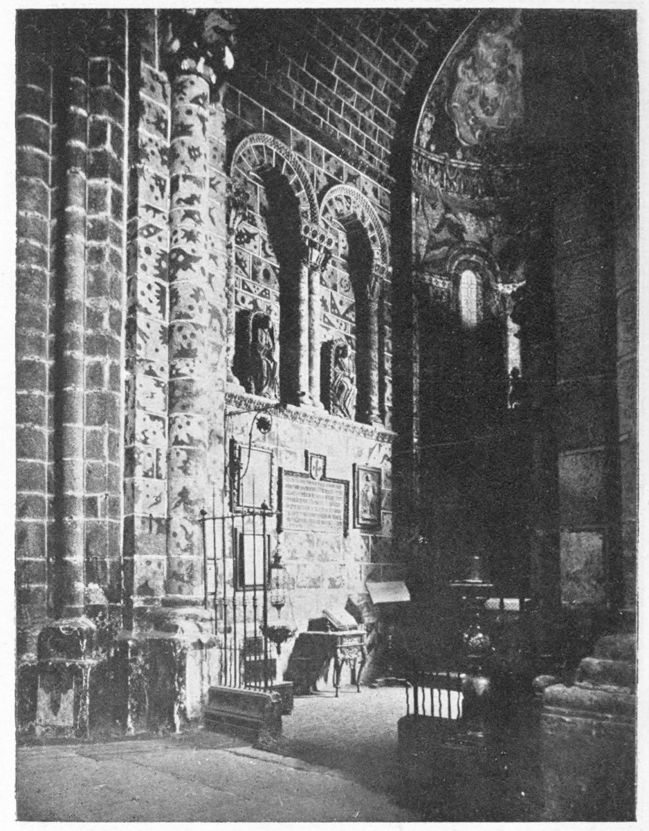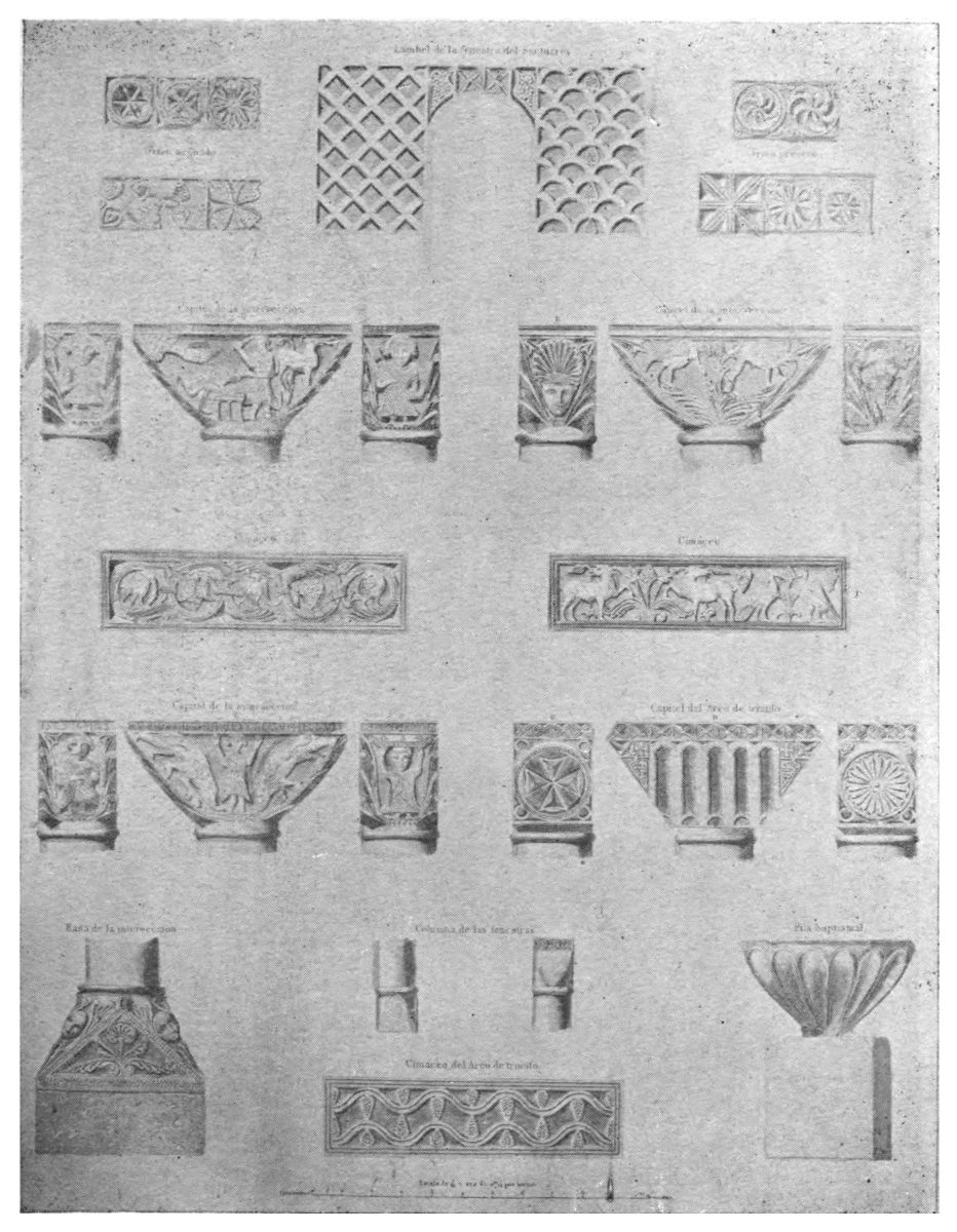 This sanctuary is now approached from the south side of the cathedral by a flight of twenty-two steps, built in the sixteenth century. We reach first the chapel, or ante-cámara, restored if not entirely constructed in the reign of Alfonso VI. (1072-1109), and representing the highest pitch of development reached at that time by Romanesque art in Spain. The roof is groined, and supported on each side by six columns built into the wall. Each column consists of two pilasters, rising from high pedestal bases, and supporting the statues of two Apostles. These figures are expressive, though rude, and the draperies are graceful and natural. At their feet are fantastic animals. The capitals of the columns are richly and beautifully carved with foliage, and with compositions representing scenes from the life of the Saviour and combats between men and lions. The capitals of the small pillars at the corners of the pedestals are also curious and delicately carved. Over the door are three heads in relief, of Christ, the Virgin, and St. John, early Romanesque work once painted and then disfigured by whitewash. The pavement of hard argamasa, or tessellated work, resembles, as Ford{45} remarks, Norman-Byzantine works in Sicily. Beneath is a crypt, or lower chapel, dedicated to St. Leocadia.
