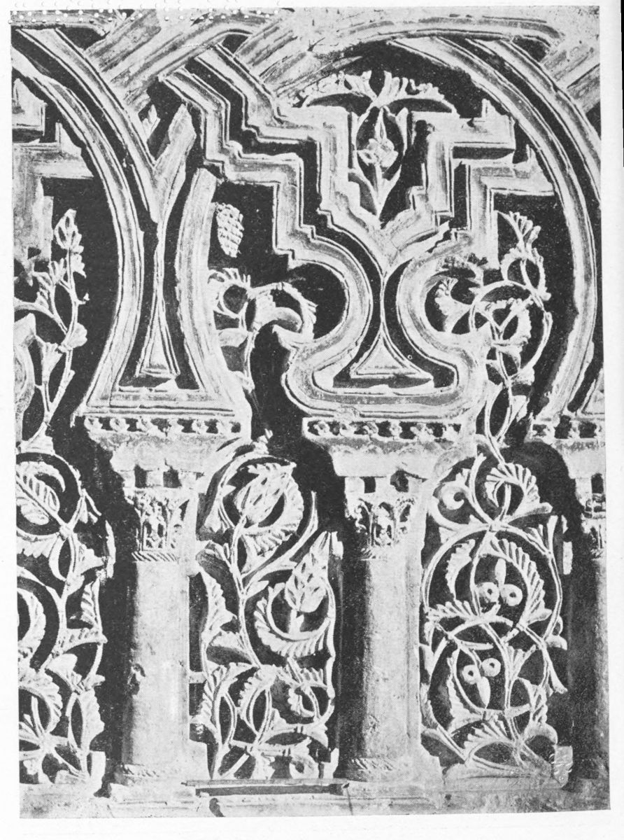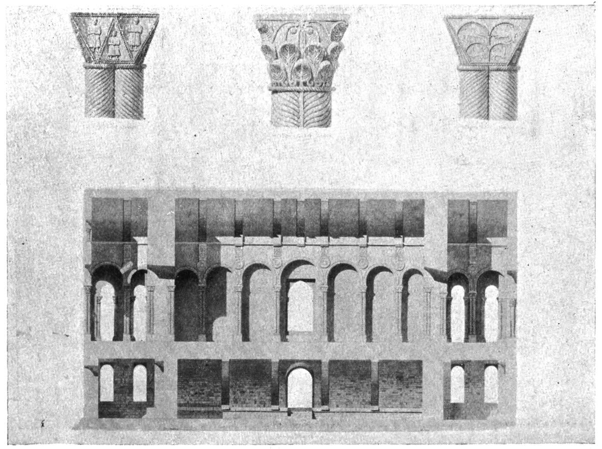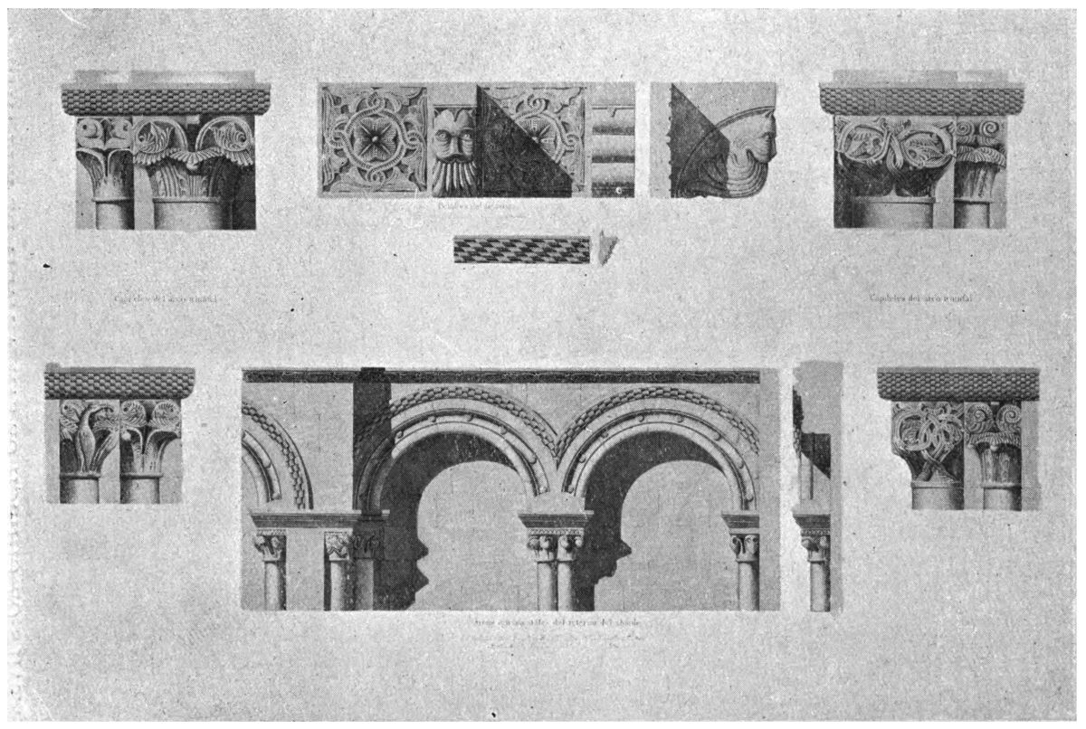 This sanctuary is now approached from the south side of the cathedral by a flight of twenty-two steps, built in the sixteenth century. We reach first the chapel, or ante-cámara, restored if not entirely constructed in the reign of Alfonso VI. (1072-1109), and representing the highest pitch of development reached at that time by Romanesque art in Spain. The roof is groined, and supported on each side by six columns built into the wall. Each column consists of two pilasters, rising from high pedestal bases, and supporting the statues of two Apostles. These figures are expressive, though rude, and the draperies are graceful and natural. At their feet are fantastic animals. The capitals of the columns are richly and beautifully carved with foliage, and with compositions representing scenes from the life of the Saviour and combats between men and lions. The capitals of the small pillars at the corners of the pedestals are also curious and delicately carved. Over the door are three heads in relief, of Christ, the Virgin, and St. John, early Romanesque work once painted and then disfigured by whitewash. The pavement of hard argamasa, or tessellated work, resembles, as Ford{45} remarks, Norman-Byzantine works in Sicily. Beneath is a crypt, or lower chapel, dedicated to St. Leocadia.