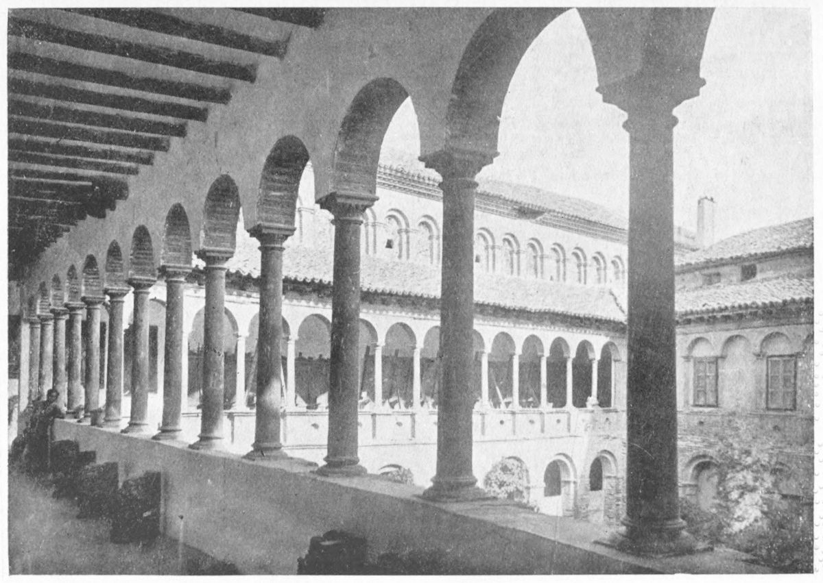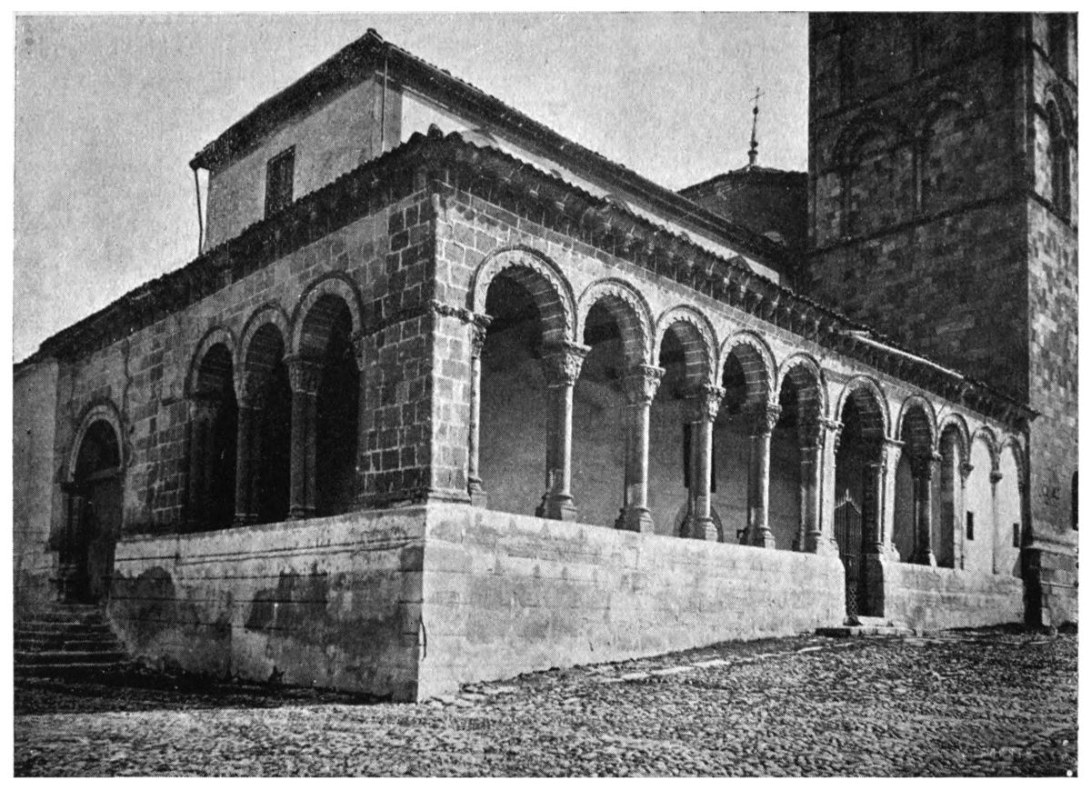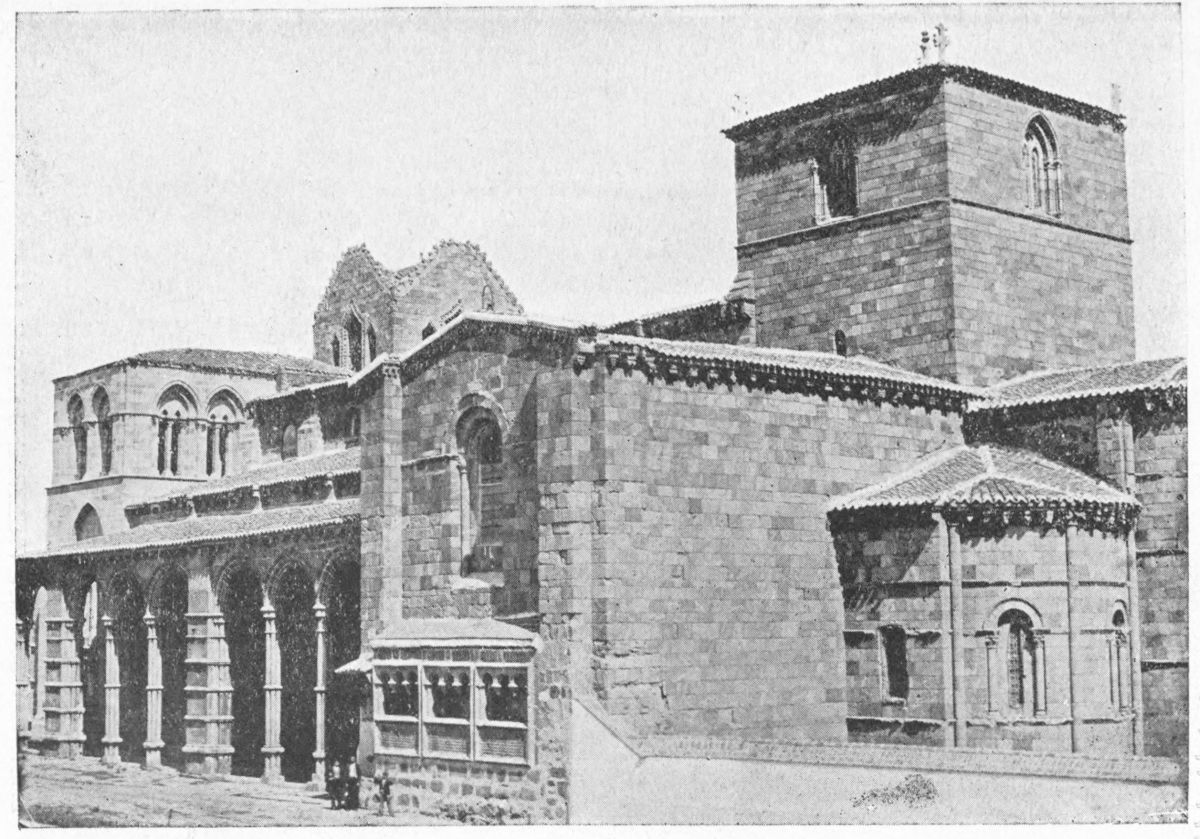 On the north this venerable church is flanked by a very beautiful Romanesque cloister of fourteen semicircular arches in three bays. The shafts, says Street, are moulded and wrought in imitation of the coupled columns of early Italian artists. This cloister, together with the steeple, makes up the most picturesque group of buildings in Valladolid, and is well worth careful preservation, if not restoration.