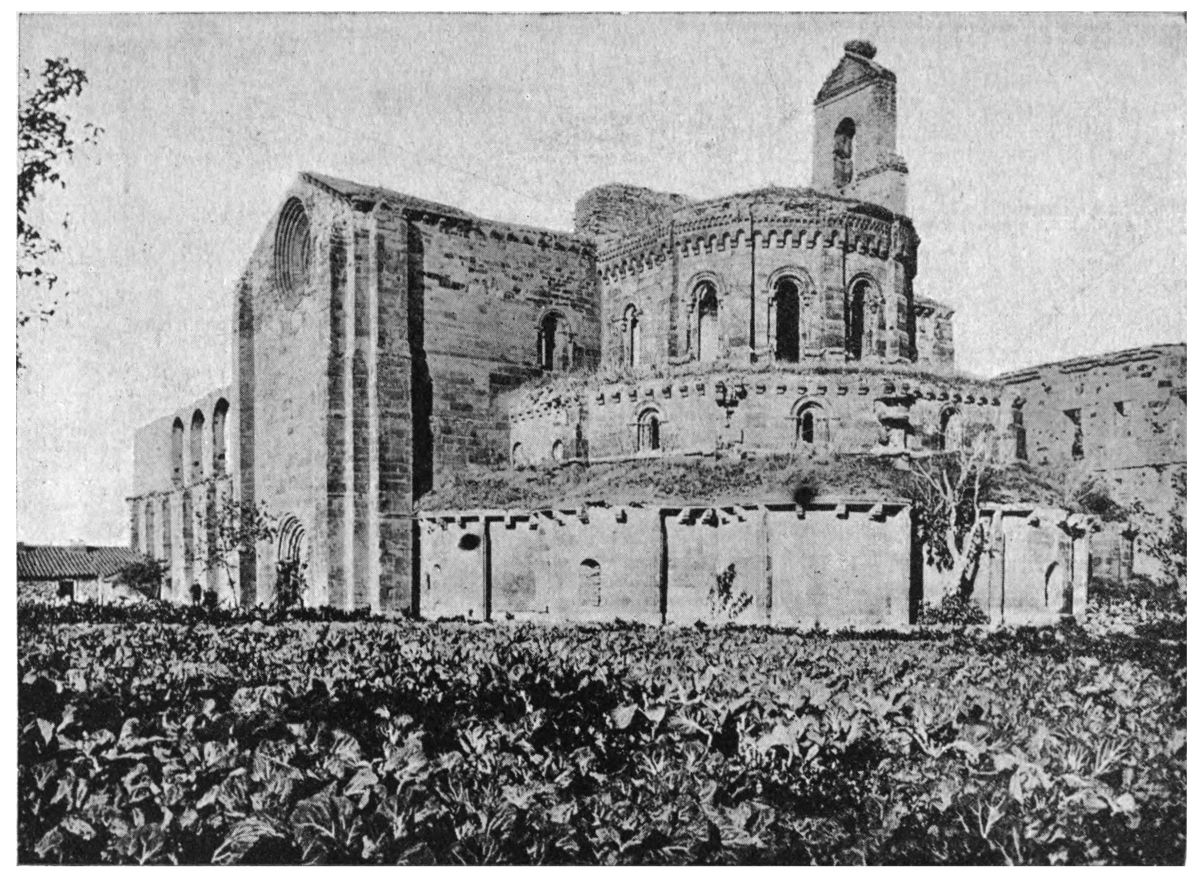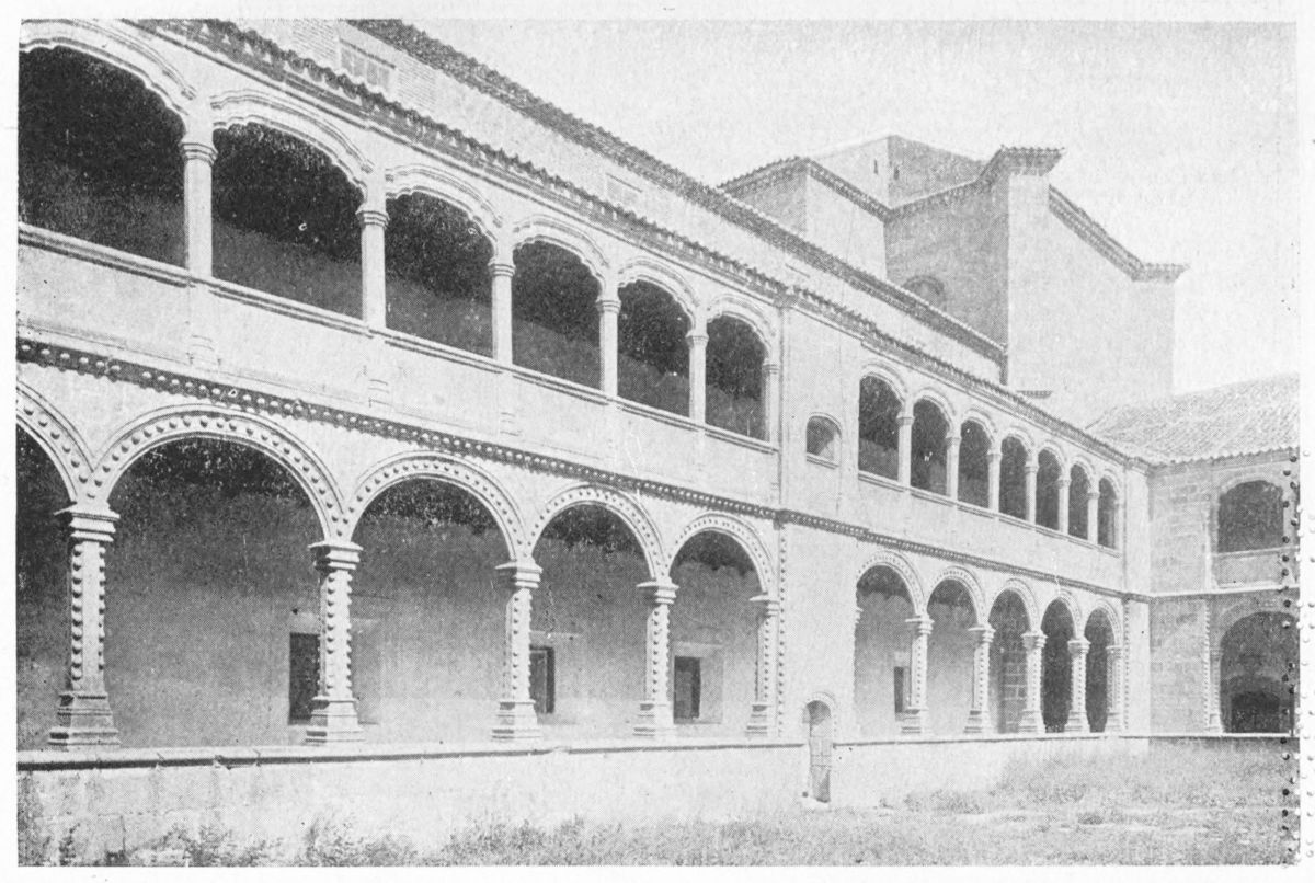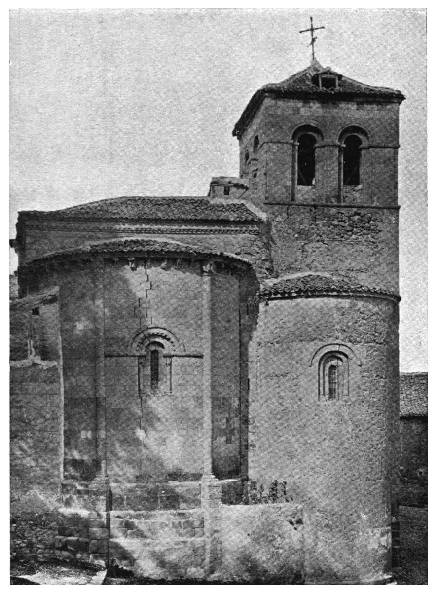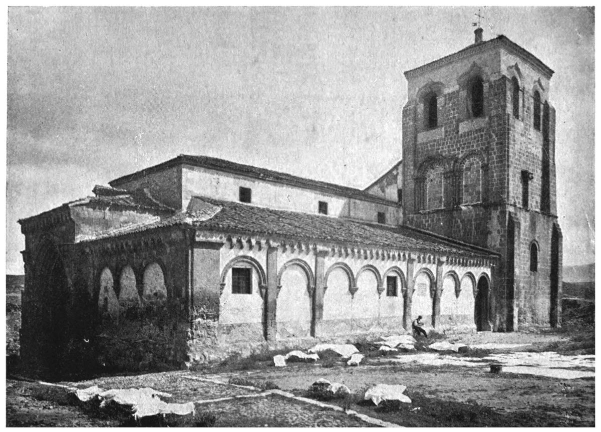 On the north this venerable church is flanked by a very beautiful Romanesque cloister of fourteen semicircular arches in three bays. The shafts, says Street, are moulded and wrought in imitation of the coupled columns of early Italian artists. This cloister, together with the steeple, makes up the most picturesque group of buildings in Valladolid, and is well worth careful preservation, if not restoration.