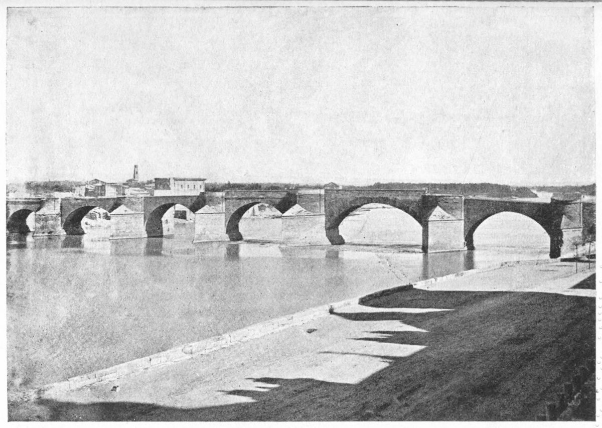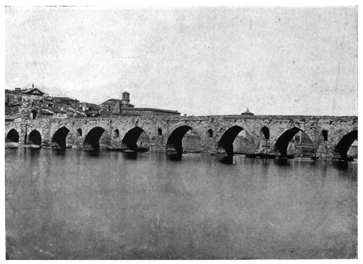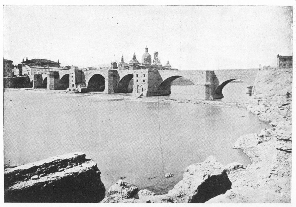Close by, the yellow Ebro is spanned by the seven arches of the Puente de Piedra. Its origin is of unknown antiquity. It was here in 1435, when one of the arches collapsed—presaging the destruction by the Genoese of the Aragonese fleet which sailed that day; and the inscription mentioning Alfonso V., and the date 1437, can only refer to its reconstruction. And across this bridge we pass into the stern, desert country of Aragon, and so on to the distant, gleaming Pyrenees.{163}