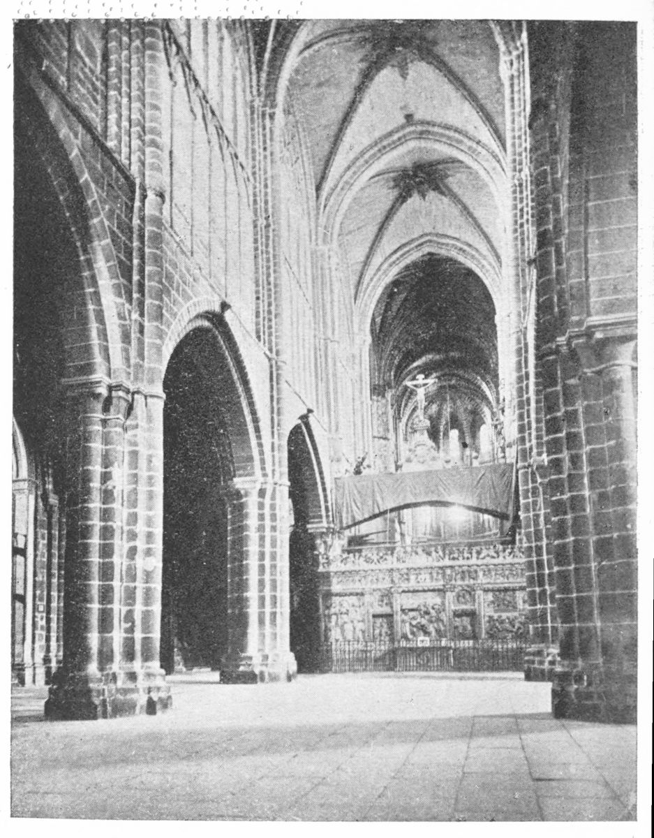 Over the chancel is the lantern, octagonal in plan, which replaced an earlier one in the first quarter of the sixteenth century. The work was undertaken by Enrique de Egas, only at the{150} express command of the king. The lower part is adorned with statues in niches, and with the canting arms (the half-moon) of the family of Archbishop de Luna.