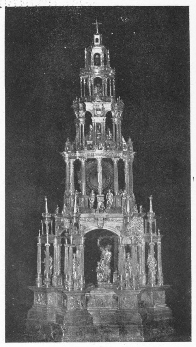 In the sacristy is one of the finest specimens of the metal-work for which Spain has always been renowned. The solid silver monstrance, by Juan de Arfe, is 6½ feet high, and weighs upwards of 150 lbs. It is in the shape of a temple in four stories, two of which are octagonal, and two circular. Statuettes of Adam and Eve, and a{24} relief of the mystery of the Conception, adorn this exquisite work, for which the artificer received 44,000 reals.