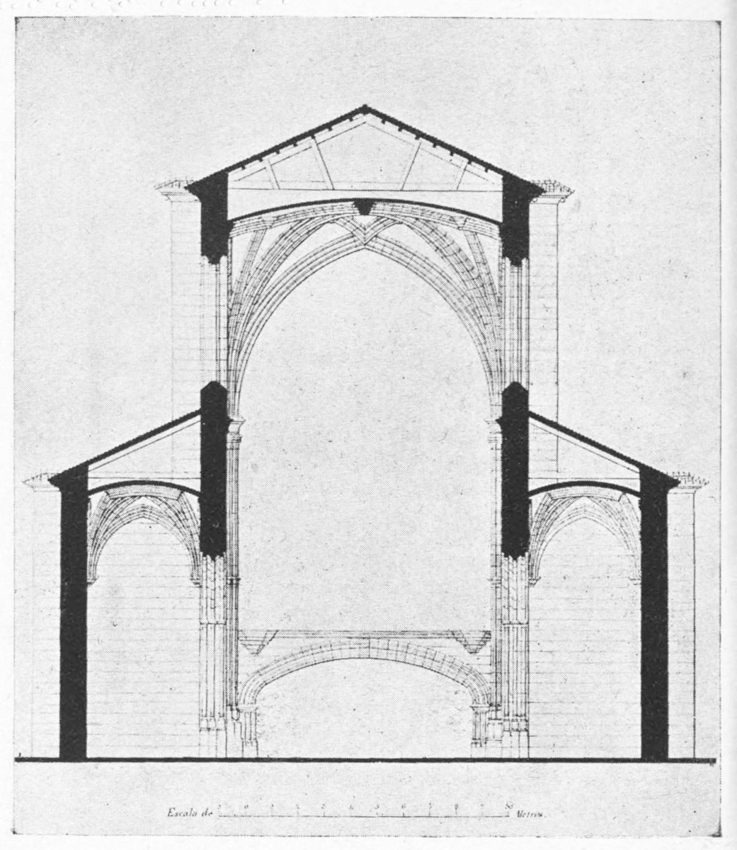 The church is of unusual breadth, there being two aisles and a row of chapels on each side of the nave. ‘The nave and aisles,’ says the{149} authority we have just quoted, ‘are all roofed at the same level, the vaulting springing from the capitals of the main columns, and the whole of the light is admitted by windows in the end walls, and high up in the outer walls of the aisles. In this respect Spanish churches of late date almost always exhibit an attention to the requirements of the climate, which is scarcely ever seen in the thirteenth and fourteenth centuries; and this church owes almost all its good effect to this circumstance, for it is in light and shade only, and neither in general detail nor in design that it is a success.’