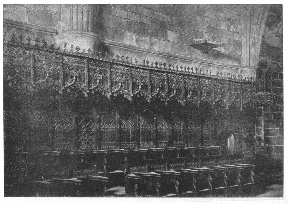 The choir stalls are richly carved with caprices and scenes, ‘ill according,’ remarks a Spanish writer, ‘with the sanctity of the place.’ But the backs of the lower seats bear representations of Biblical characters, which, like the canopies above, are exquisitely carved. The organs are Churrigueresque, and the gorgeous Gothic trascoro is in hardly better taste. The chapels date mostly from the seventeenth and eighteenth centuries, and contain nothing of interest, except the alleged body of St. Eulalia of Merida.