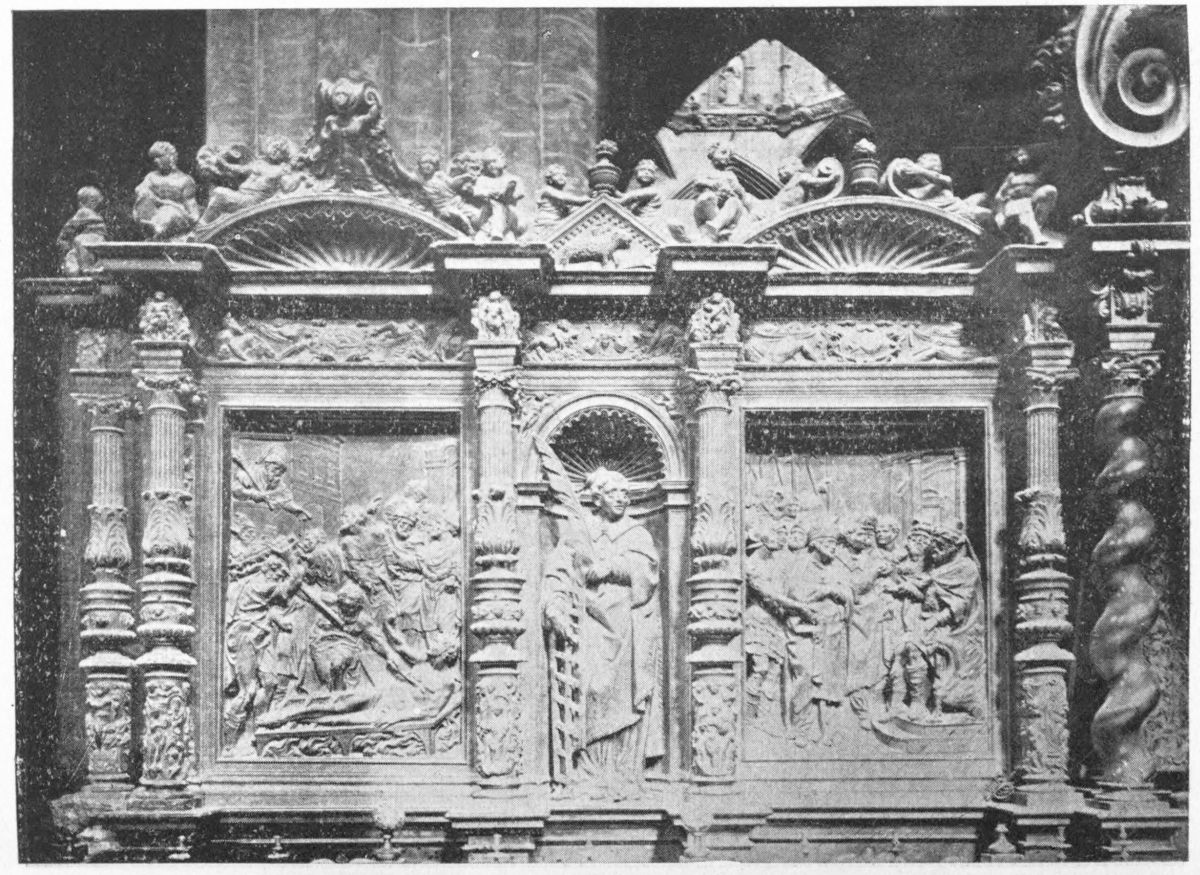 Within these walls have been collected treasures from the demolished, dismantled, and disused churches, convents, and palaces of the city, many of the objects now here having been removed from their original positions by the French and left behind them in the hurry of flight. Here we find the retablo executed between 1526 and 1532 for the church of San Benito by Alonso Berruguete. Street, who disliked all the{34} works of the Renaissance, denounced this altarpiece in unmeasured terms; but no impartial critic can deny the beauty of certain of the figures, notably those of Abraham and St. Sebastian. In the museum may also be seen the choir stalls from the same church, carved by the master in 1528—ten years before he designed the silleria of Toledo. The work displays marvellous imagination and great delicacy in the execution.