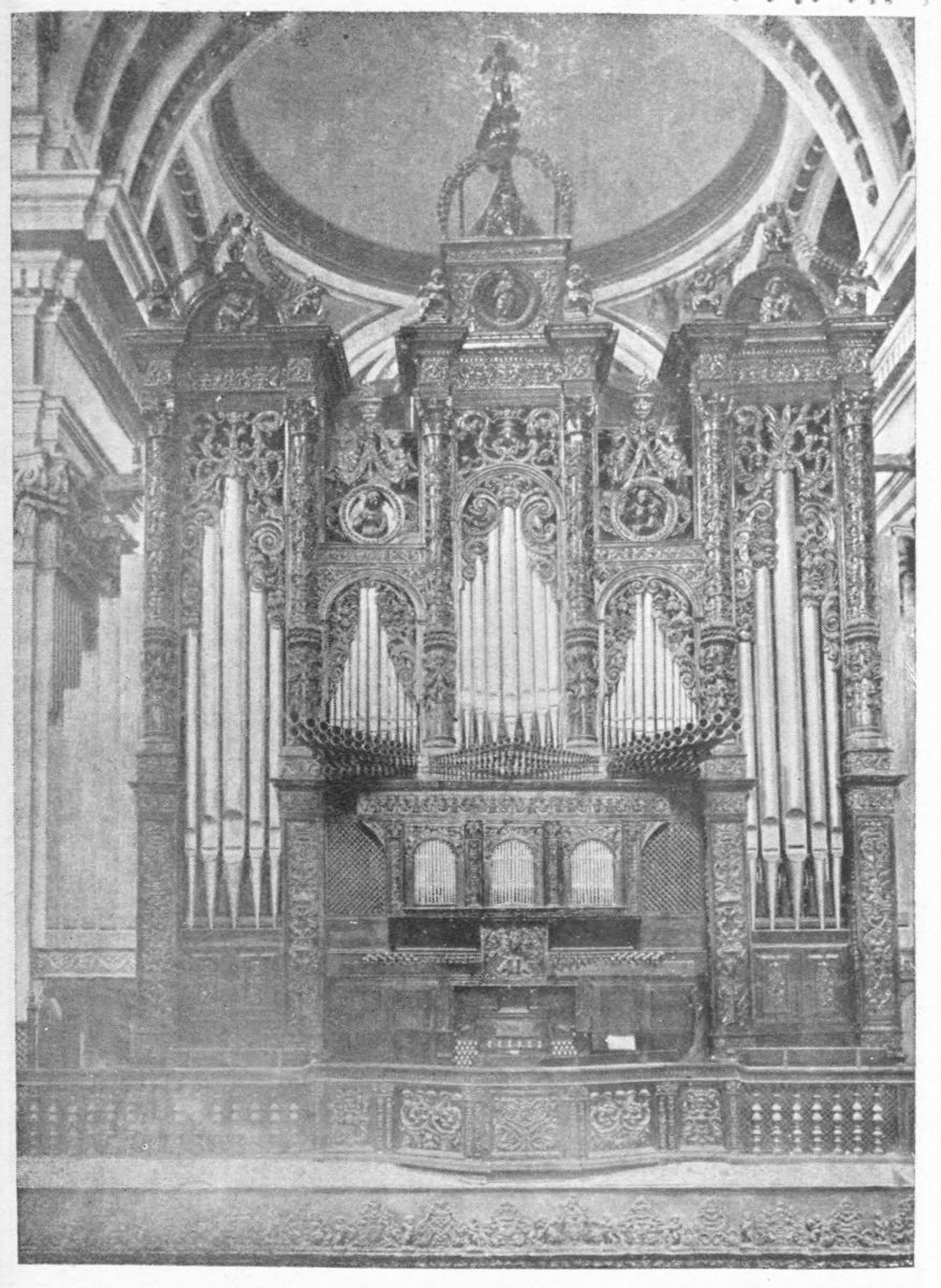 The west front was completed as late as 1685 by Julian Garza and Juan Bautista Contini. It is in the classical style of that period, and is in two stages separated by a broad entablature. The lower stage is adorned with massive Corinthian columns, and pierced with three doorways; the upper story is decorated with three statues of Christ and the Apostles Peter and Paul, by Giral, placed in niches; above is a{148} pediment finished with an ugly finial. This front is flanked by an octagonal tower of four stages, each smaller than the lower one, and is therefore not inaptly compared by Ford to a telescope. This structure is in the same style and reveals the same want of taste as the adjoining façade. The third stage contains the belfry. The whole is surmounted by a weather-vane and steeple, perched on a Moorish-looking dome. The statues of the Apostles on the belfry are by Acali. There is no other façade worthy of notice; but the Puerta de la Pavostria is in the better and earlier classic style of the sixteenth century. It derives its name from a functionary known as the Pavorde, who here distributed alms.