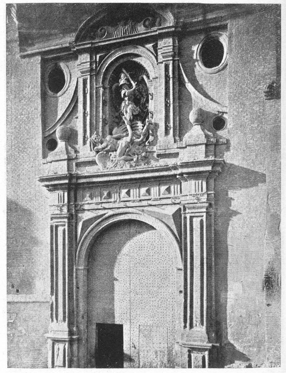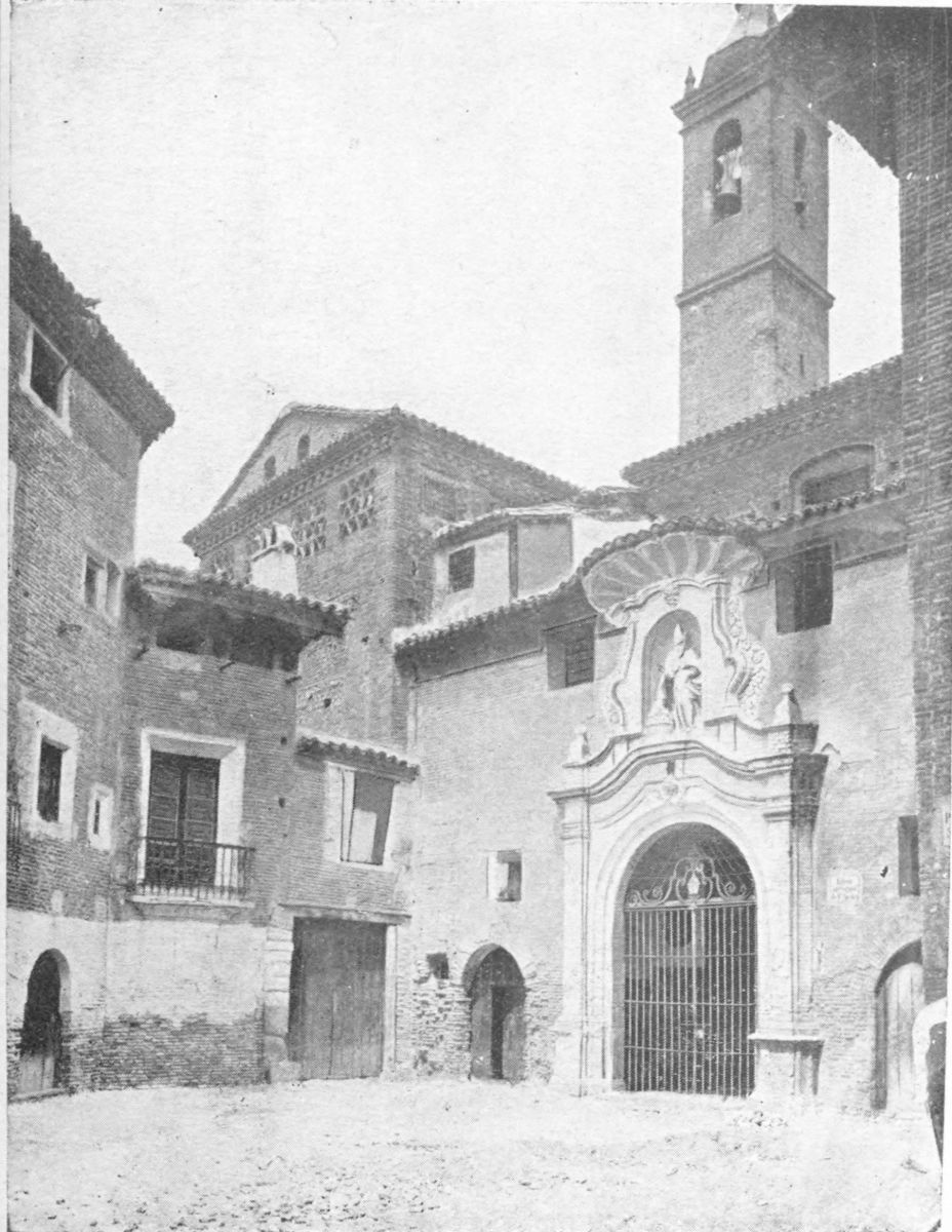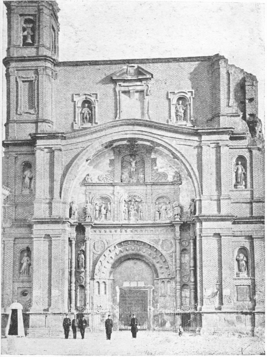 The church of Santa Engracia, which figured prominently in the great siege, commemorates the massacre of a number of Christians of both sexes by the soldiery of Dacian. The bodies of{155} the saints, Engracia and Lupercius, having been discovered here in 1389, the church already built on the spot was enlarged, and finally rebuilt with great splendour by Ferdinand the Catholic. A terrific explosion on August 13, 1808, completely wrecked the fabric, leaving little more than the plateresque portal, believed to have been designed by Morlánes. The entrance is through a round arch recessed within another, and surrounded by a retablo-like arrangement of niches containing groups. The outer arch is flanked by four statues of doctors of the Church in niches, and surmounted by statues of Ferdinand and Isabel.