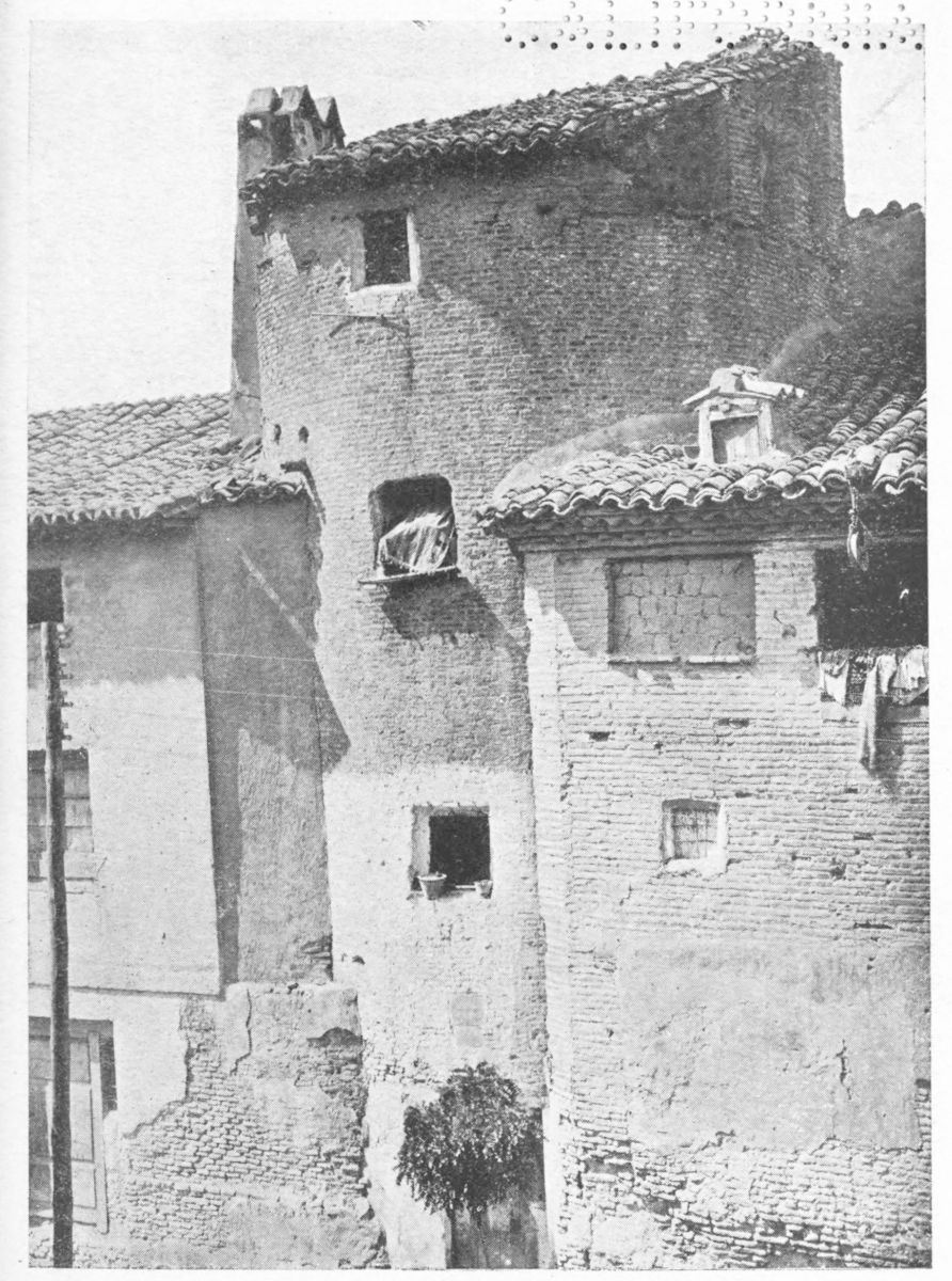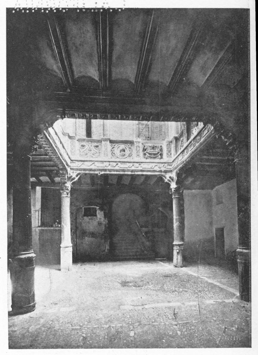 A great many of the fine old mansions (solares) of the aristocracy and merchants of Zaragoza disappeared in the siege, or to permit of modern improvements. Those which remain date mostly from the sixteenth century. The finest, on the whole, is the Casa de la Infanta, so-called as having been the residence of La Vallabriga, a lady banished from Madrid for marrying the{158} Infante Don Luis. The house was built by a rich merchant named Gabriel Zaporta in the middle of the sixteenth century. A square entrance admits to a court, round which runs a gallery, upheld by columns on fluted pedestals, and formed of caryatide figures interlocked. On these rest the capitals, elaborately carved with masks, and on these again is borne the gallery, the arches and parapet of which are enriched with medallions, masks, grotesques, and foliage. The decoration is a fine specimen of the plateresque style. The staircase, in the same style, is worthy of note.