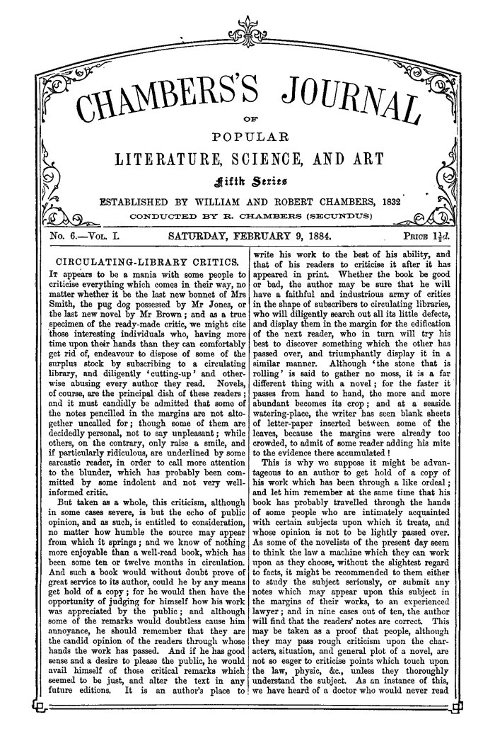 These remarks may serve to show that the public, although they may accept a taking title, a pretty cover, and a pound or so of toned paper, as a novel, will also exercise their right of picking its contents to pieces as soon as possible. To show with what diligence some of them do so, we quote the following: ‘The red rose actually died the captain’s cheeks.’ The word in italics is underlined in the book, and altered in the margin to dyed. This, of course, is merely a printer’s error; but it serves to show how the circulating-library critic delights in ‘cutting-up’ the work of other people’s brains, and exposing to the best advantage any little defect he may discover. Then, again, in the same work, in describing the scene of a shipwreck, the author makes use of the following words: ‘Quantities of chips, and pieces of wood, and bits of iron, were floating about.’ The words in italics are underlined in pencil by some incredulous reader, who could not quite appreciate the joke, and took this method of calling the next reader’s attention to it. The words might have been a mere slip of the pen; but, as they stand underlined in the book, it is impossible to overlook them now.