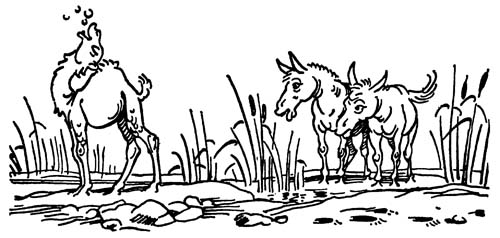 THE NEXT morning the youngest camel awoke in high spirits and ran quickly to brush his teeth in the oasis pool. He felt so reckless that he swallowed all his toothbrush water on purpose, a thing his mother had told him particularly he should never do. Then he gargled so loud that nobody could hear the waterfall any more; so loud, in fact, that the mules craned their heads around and looked critically over their shoulders at him. Next he caught sight of a group of melancholy waders, some of them looking in the water for frogs and some of them standing mournfully on one leg in the shallows. So he crept along behind the bushes[10] and then jumped out at them with such a shout that he scared them into fits before they collected themselves enough to spread their wings and fly away.