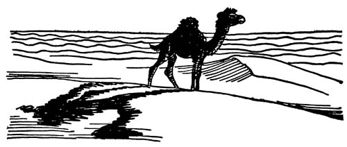 The early mornings were now a clear icy blue, but as the day advanced the heat blazed up as if a fire were sweeping across the heavens towards them. The youngest camel didn’t mind how hot it was and he had such a good opinion of his own strength that he thought he could never possibly get tired. He came skipping and jumping along behind his mother, playing games with himself and laughing out loud when the dry sand ran swift as water between his toes. But when his mother complained of the terrible heat and the long way they had to go, he lifted his soft dark eyes and looked at her long legs before him, and her tail, and he[5] thought: I love her. I love her elbows with the hair worn off them, like the old carpet the snake charmer sits on in the market place; I love the way her hump slumps when she has no more water in it, and I love the way her tail is eaten by the moths because she forgot to put it in camphor once about fifty years ago.