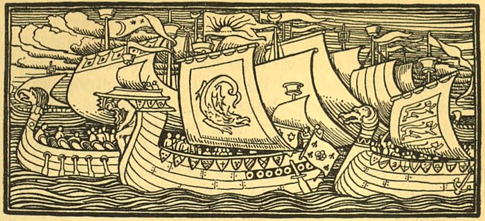 Now the king was sitting on his throne under the daïs at the upper end of the hall, and on his right hand sat the noble Alexander, and round the king on his right and his left were the nobles of the land, greybeards and youth. And when the coming of the heralds was told them the king rose from his seat, and as they stepped forward so did he, and he came to the middle of the hall and three steps further, for all men did reverence in those days to the herald. And he greeted them, and on the neck of each man he threw a chain of gold, and much he praised them for their fame. But the heralds spoke and said, “O king, we have a message for thee, nor may we delay.” And he said, “Speak on.”