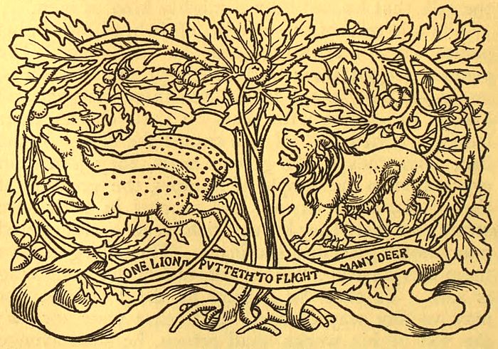 Now when Alexander had got together his band, he made ready to go out in search of his first adventure, and in few days he rode out into the world in knightly array into a land unknown, nor did he stay until he came into the land of Peloponnesus. Now the king of this land was called Nicholas, and when tidings were brought him that a band of strange knights had come into his land, he ordered that a host should be gathered together, and he with a few knights rode out far before his following, and came to the men of Alexander and began to question them in his wrath and anger, “Oh, ye knights, who is your leader, and why come you here in my land?” Then the courteous knight Alexander came to the front: “Sir knight,” said he, “Philip the fierce, king of Macedon, is my father, and I am his heir Alexander.” And the king stood up in his stirrups, and sternly looking at him, said, “Whom think you that I am?” “Sir,” said Alexander, “you are as now king of this folk, nor do I grudge your honour, but beware of pride, for wise men tell that the highest thing falls soonest, and that which is least of all is ofttimes brought to the stars.”
