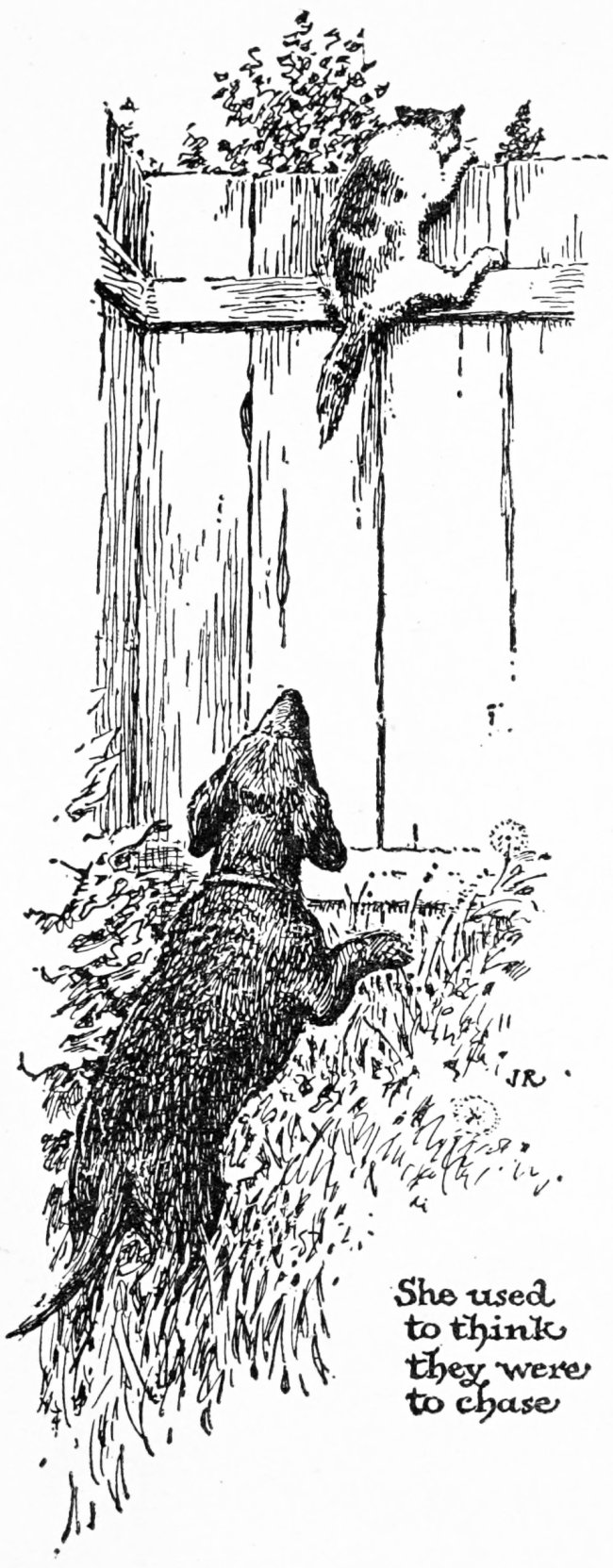 Ju-ju was a cat. She was grey, like smoke, and had a bushy tail and long hair and yellow eyes. I don’t think yellow eyes are very pretty, do you? None of us ever liked Ju-ju very much, although we soon got to respect her. She was very vain of her long hair and thick tail and used to spend hours doing nothing but washing herself. Cats are very lazy, I think, and waste too much time on themselves. Once I asked Mother what cats were for and she sighed and said she used to think they were to chase but she had changed her mind and thought now they were just to look at. Mother had a place on her nose like a scratch where the hair never grew and sometimes I’ve wondered whether Ju-ju made it.[12] When we first got out into the yard Ju-ju used to come and jump on top of one of the fence-posts and look down at us just as though we were funny and strange. That used to make us very angry and we would bark and jump at the post for the longest time. But of course we couldn’t reach her and after awhile she would blink and blink at us and then go to sleep up there! Cats are very annoying.[13] They’re almost as bad as ducks!