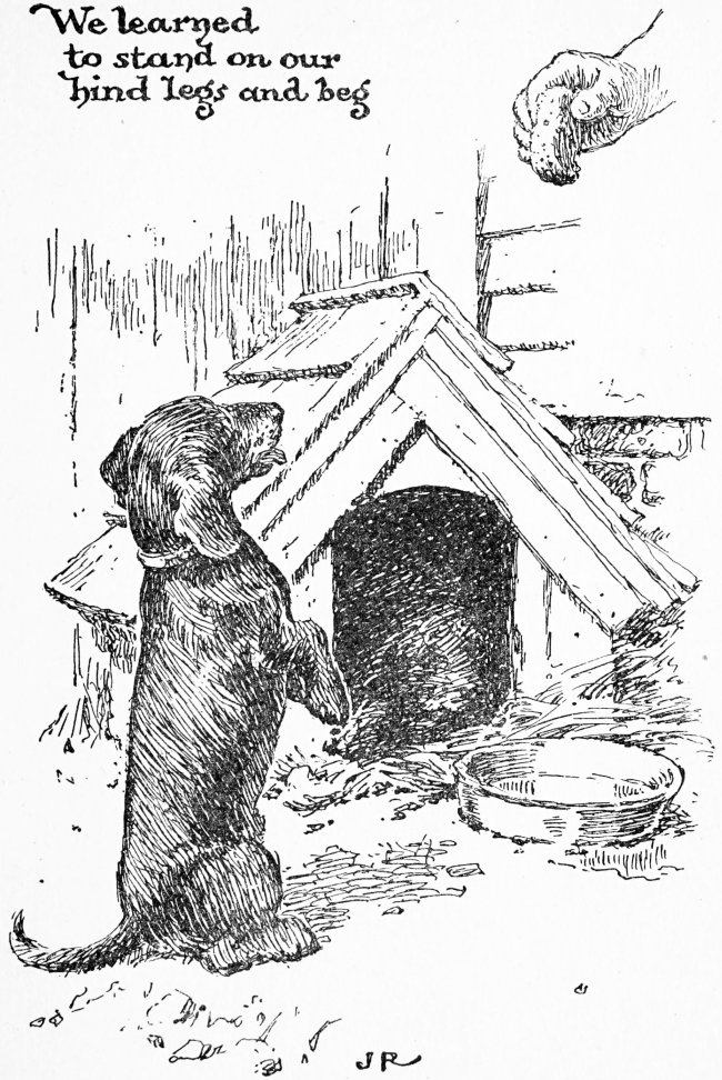 Mother had her paws full looking after us most of that summer and so she was not able to help much with the work. Of course she kept watch and taught us to, and we soon learned who to bark at and who not. When[16] the man from the butcher’s came Mother always made it a point to be very polite to him. She wagged her tail and sniffed his boots and followed him around to the kitchen door. He smelled very nice. Sometimes he gave us small pieces of meat and we were always glad to see him. But when a tramp or a pedlar came Mother barked and the hair stood up all along her back. We soon learned to do the same and tramps didn’t very often come much farther than the gate.