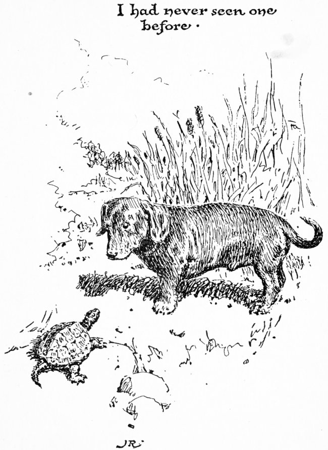 The Family—we called the Master, the Mistress and the Baby the Family—lived in the country in a beautiful white house with green blinds that stood on top of a little hill and had trees and fields all around it. There was a pond, too, and a brook that ran out of it. That’s where the ducks lived. Ducks are very[10] funny things. Later I’ll tell you something about them. There was a stable, as well, and outside the stable was a yard fenced in with wire netting, and in the corner of the yard was what they called the Kennel. That was where I was born. The yard was quite large and after we were allowed to run around in it, we had a fine time. There was so much to see from it: the house and the duck-pond and the country road, with people going by that had to be barked at, and the place where William washed the carriages when the weather was fine, and many other things. Also, there were squirrels in the trees, and birds, too. And there was Ju-Ju.