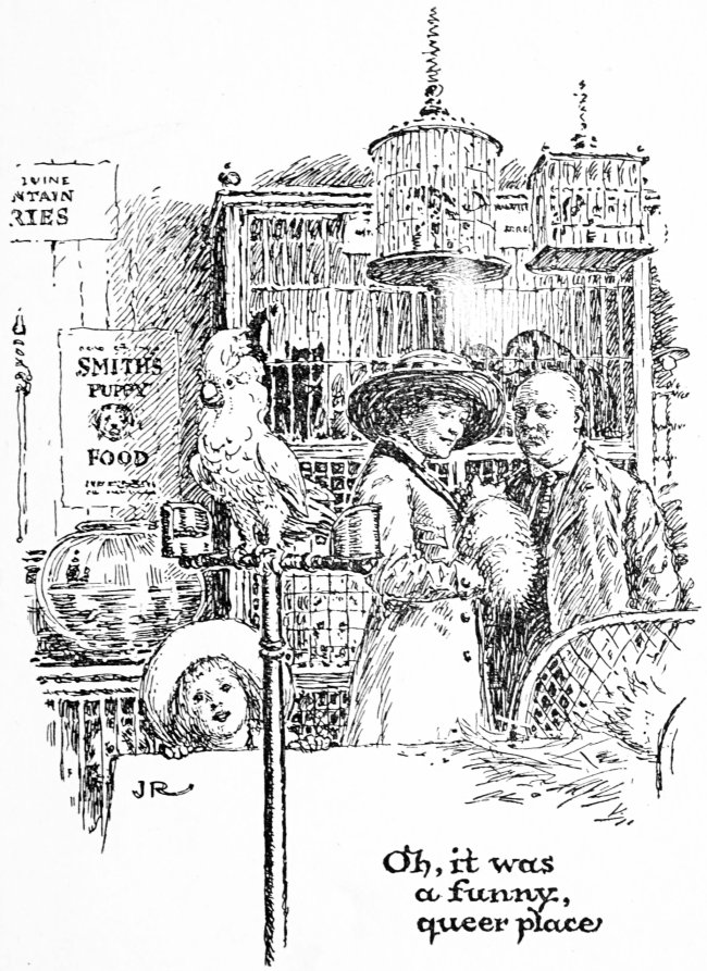 I made several friendships at that store. There was Mouser, who lived next cage to me. I never thought that I should like a cat, but I did. He was a big grey cat and had the longest whiskers I ever saw. He and I would put our heads through the bars and have fine long talks together. He had seen a great deal of life and had always lived in the City. At first he wouldn’t believe the things I told him about the country. He took quite an interest in Ju-Ju and said he thought she was a very lucky cat. Mouser didn’t know who his parents were or where he was born. Isn’t that strange? Fancy not knowing your own[168] father or mother! I wouldn’t like that, would you?