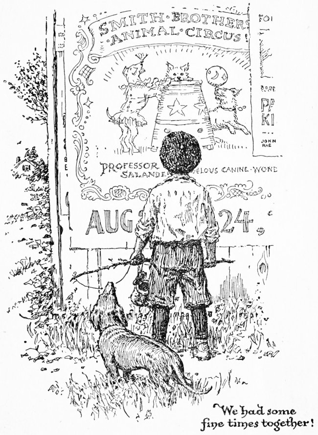 Then there was Prince. Prince was a funny, good-natured dog who lived in a big cage across the aisle. He wasn’t any regular[171] kind of dog, but a little of every kind. He had a long brown coat and a shaggy tail and a pointed nose and very yellow eyes. One of his ears stood up straight and the other fell over just as if it was tired. But he was a real nice, jolly fellow, and had the finest, deepest bark I ever heard. He was just about my age and had been born in the country. One day he came with his master to the city to sell a load of vegetables at the market and another dog quarrelled with him and they had an awful fight and the other dog bit him so that he had to run away. And when he stopped running he was quite lost! He hunted around and at last he found the market again, but his master had gone. So he stayed there for a long time and the marketman gave him pieces of meat and he got along very nicely. He thought that some day his master would come back again. And perhaps he did, but Prince wasn’t[172] there because one day a boy tied a piece of rope about his neck and took him to the animal dealer’s and sold him for fifty cents.