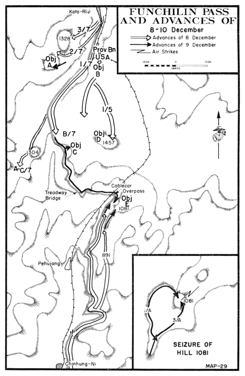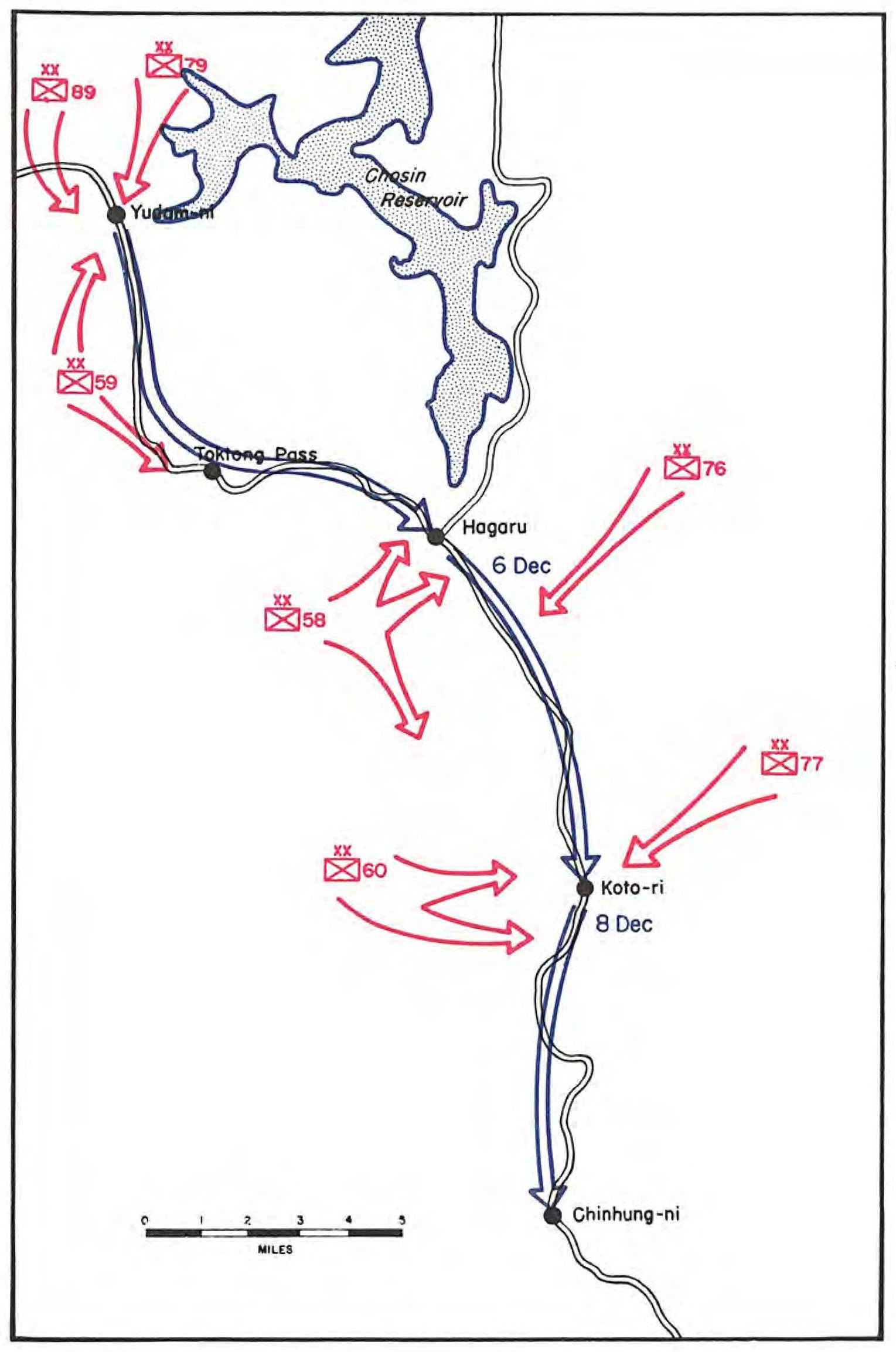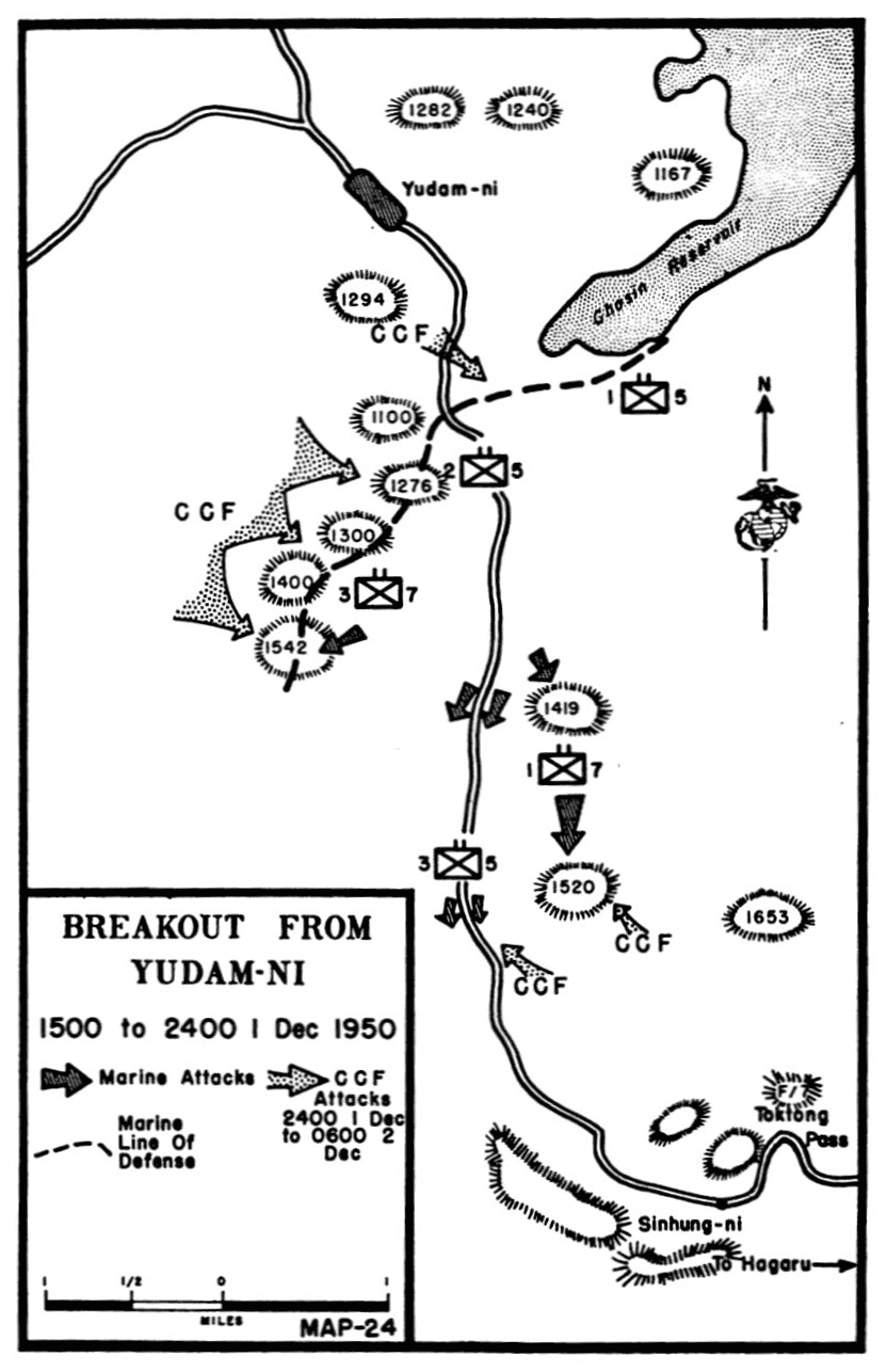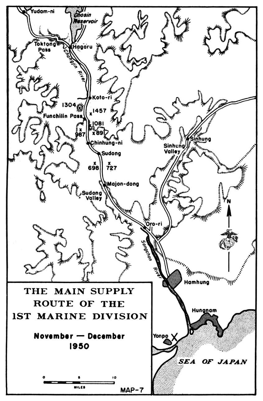 | Assembly of Division at Koto-ri—Activation of Task Force Dog—Air Drop of Bridge Sections—Division Planning for Attack—Battle of 1/1 in the Snowstorm—Advance of RCT-7 and RCT-5—Marine Operations of 9 and 10 December—Completion of Division Breakout | ||