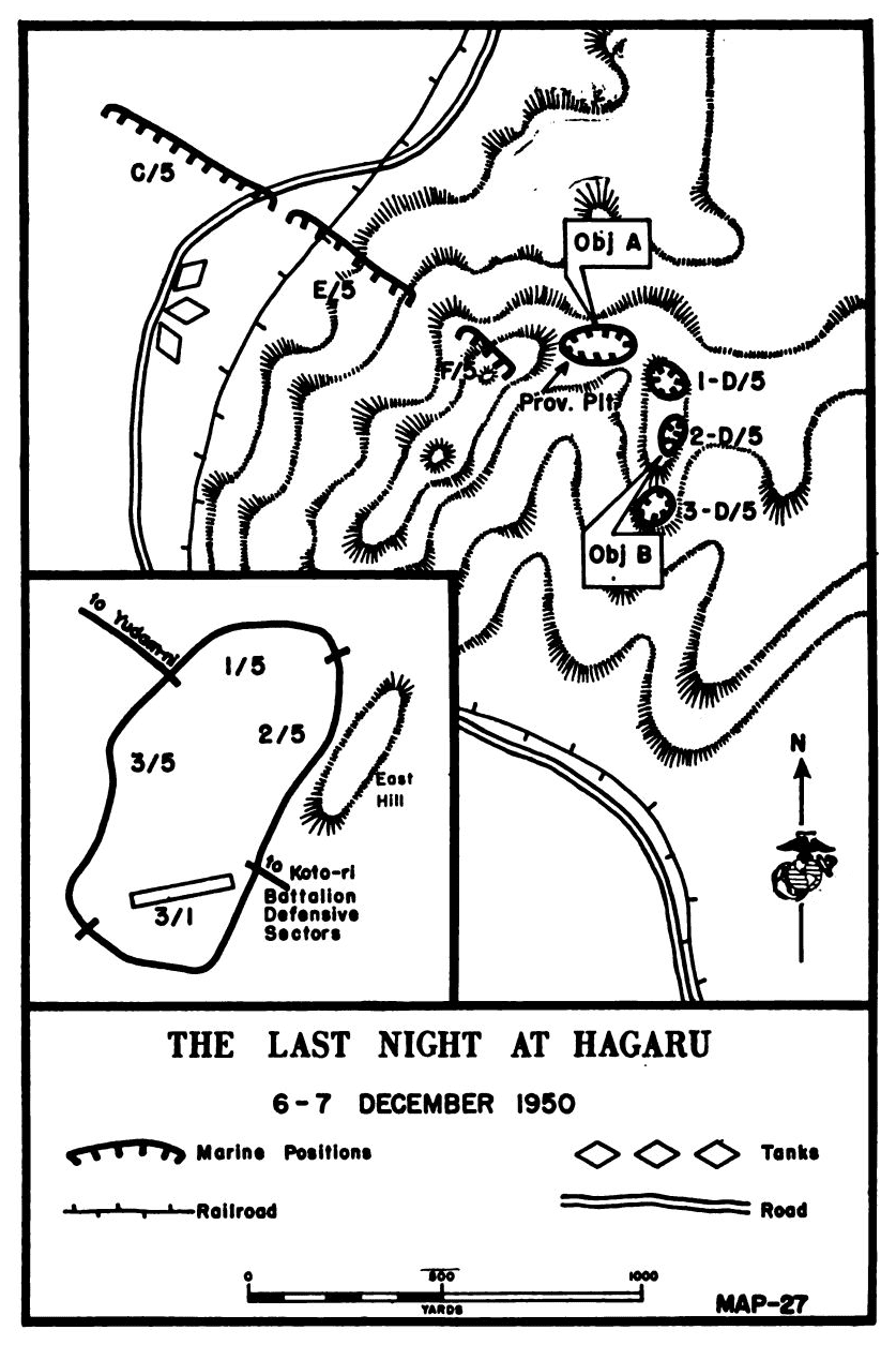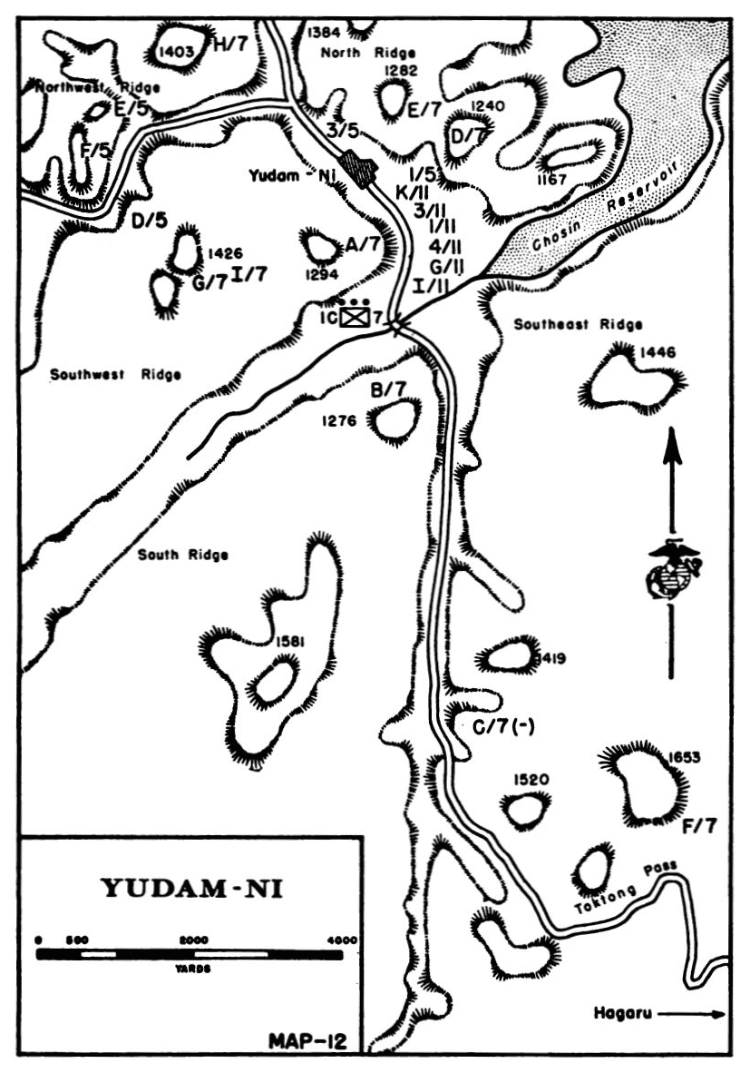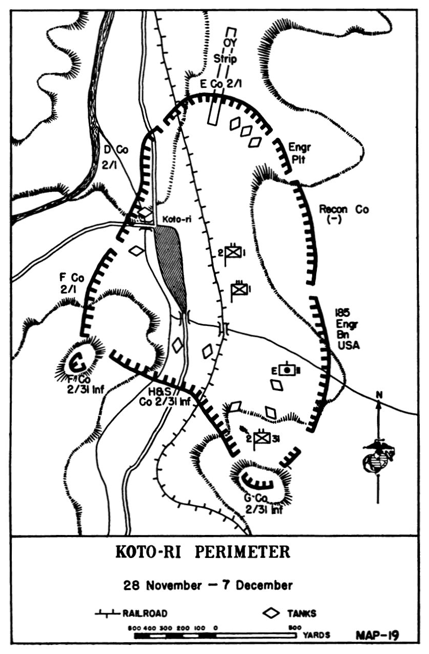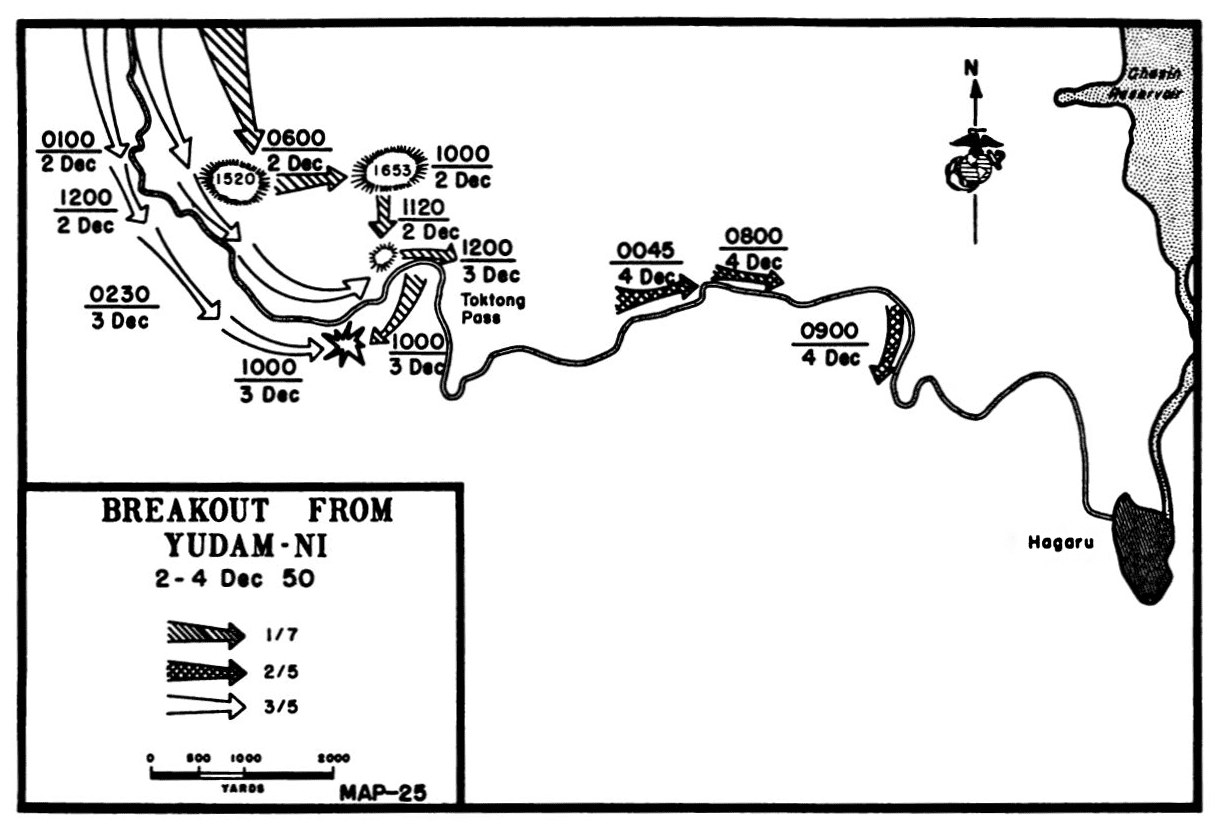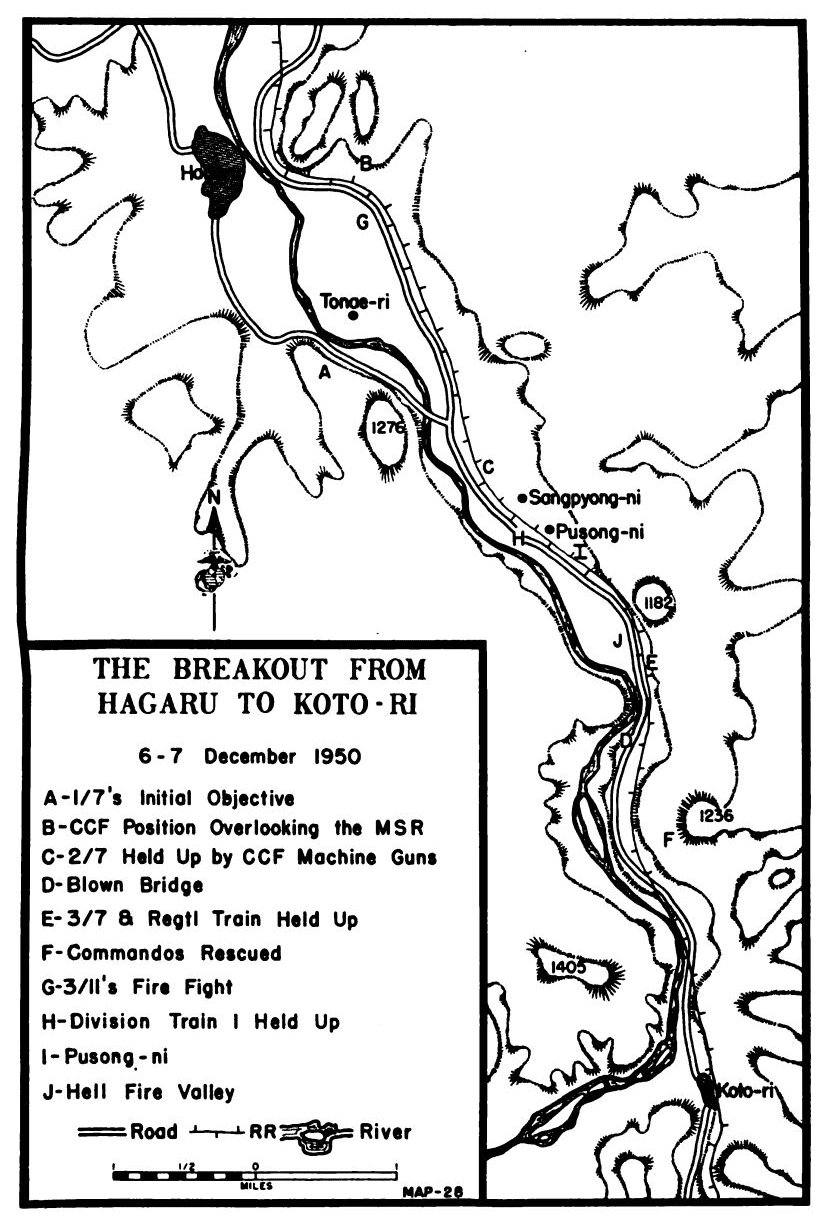 | Assembly of Division at Koto-ri—Activation of Task Force Dog—Air Drop of Bridge Sections—Division Planning for Attack—Battle of 1/1 in the Snowstorm—Advance of RCT-7 and RCT-5—Marine Operations of 9 and 10 December—Completion of Division Breakout | ||