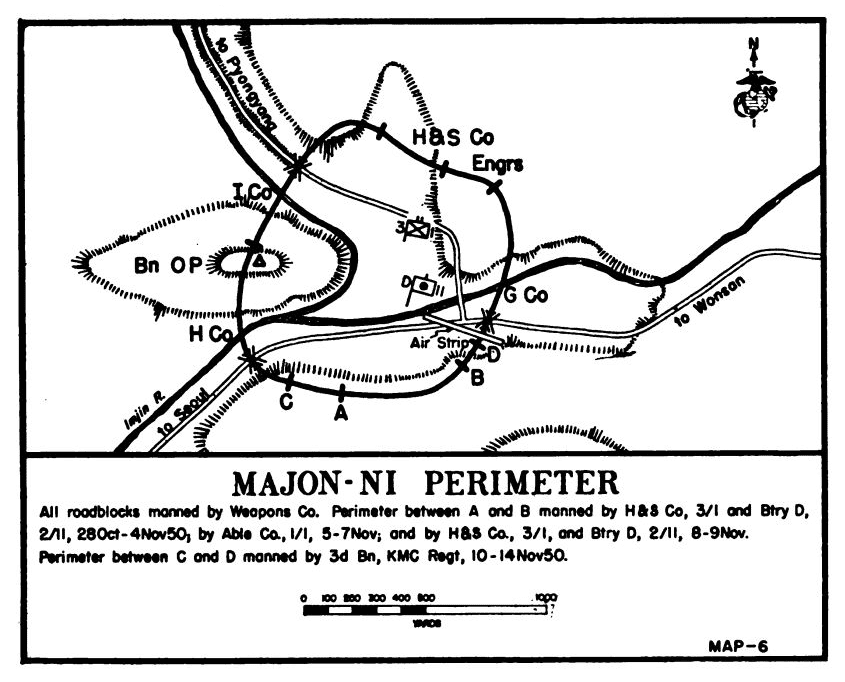 | Marines Units Tied in for Defense—Political Aspects of Mission—Roads Patrolled by Rifle Companies—Air Drop of Supplies Requested—First Attack on Perimeter—KMC Battalion Sent to Majon-ni—Movement of 1st Marines to Chigyong | ||