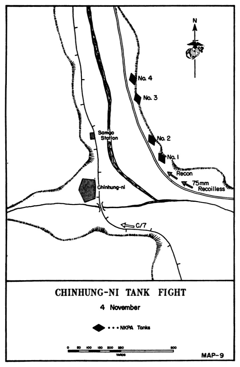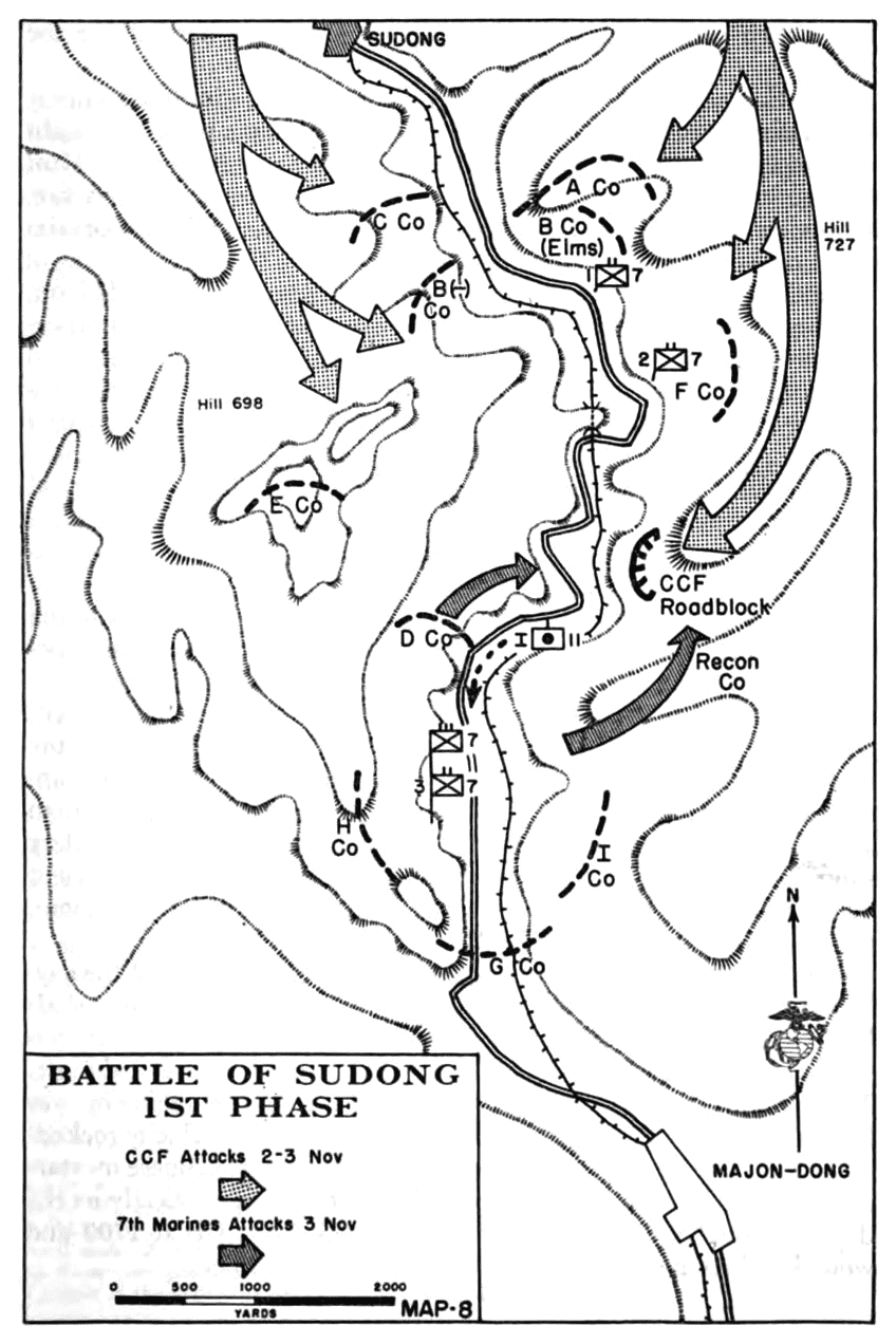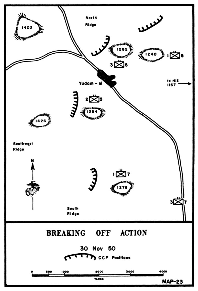 | The MSR from Hungnam to Yudam-ni—ROKs Relieved by 7th Marines—CCF Counterattack at Sudong—Two Marine Battalions Cut Off—End of NKPA Tank Regiment—The Fight for How Hill—Disappearance of CCF Remnants—Koto-ri Occupied by 7th MarinesVIII | ||