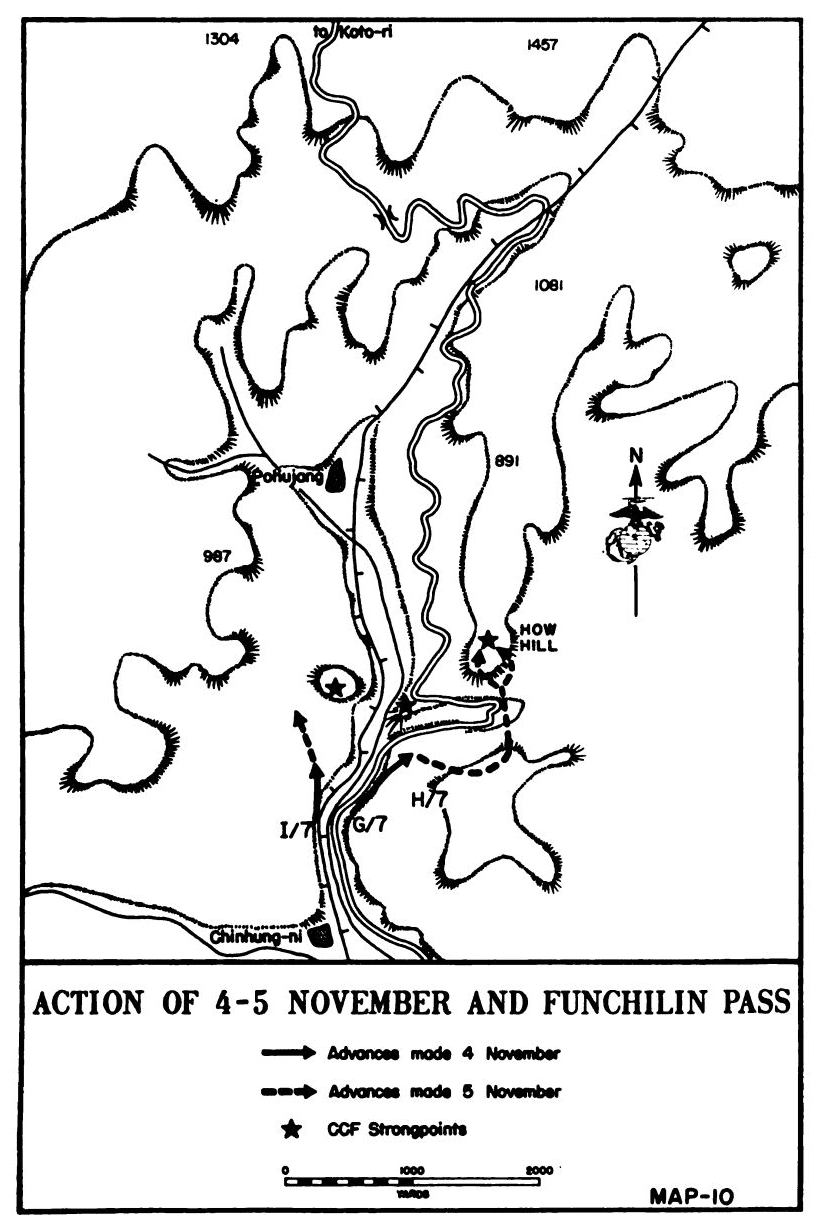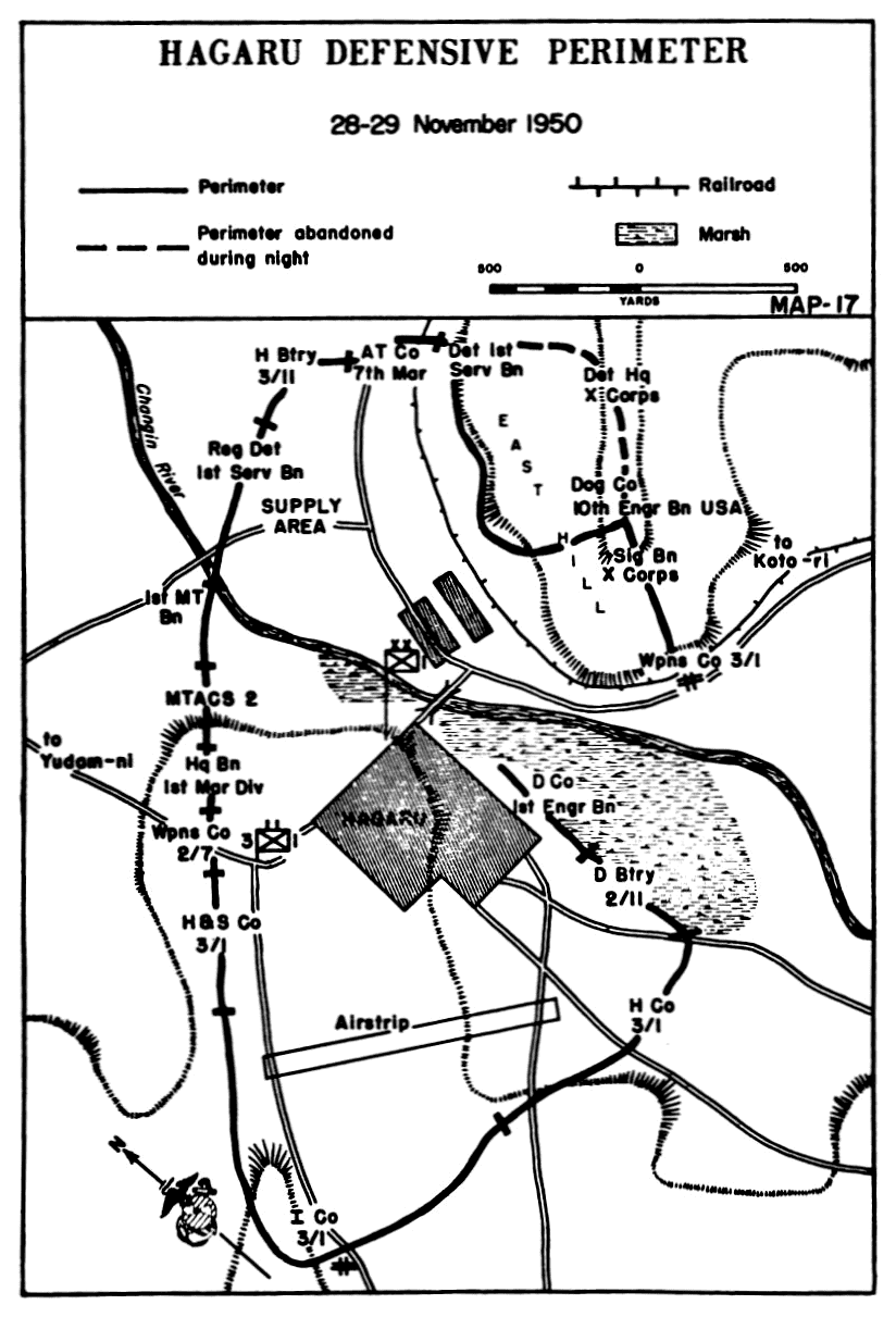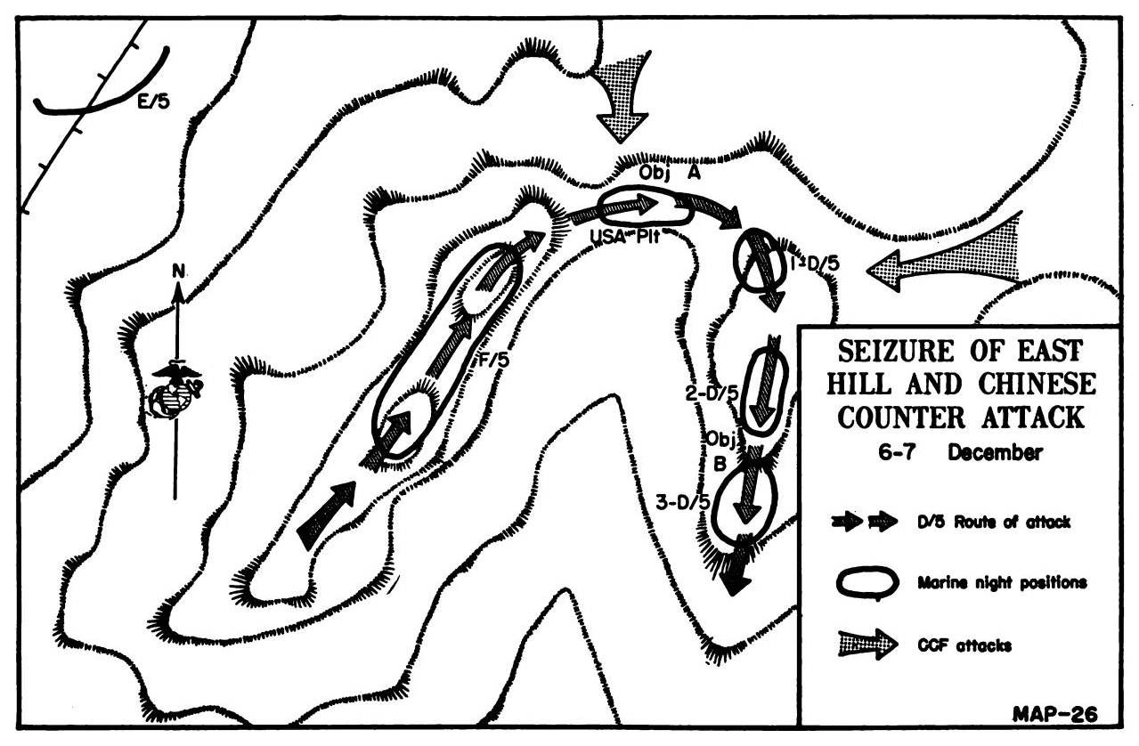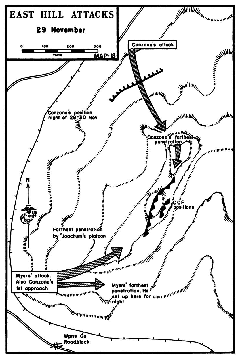 | Four-Mile Perimeter Required—Attempts to Clear MSR—Intelligence as to CCF Capabilities—Positions of Marine Units—CCF Attacks from the Southwest—East Hill Lost to Enemy—The Volcano of Supporting Fires—Marine Attacks on East Hill | ||