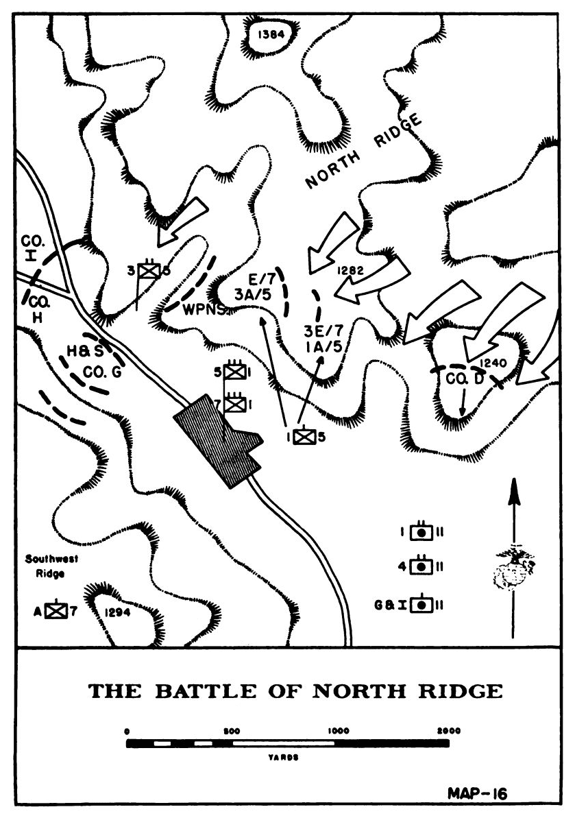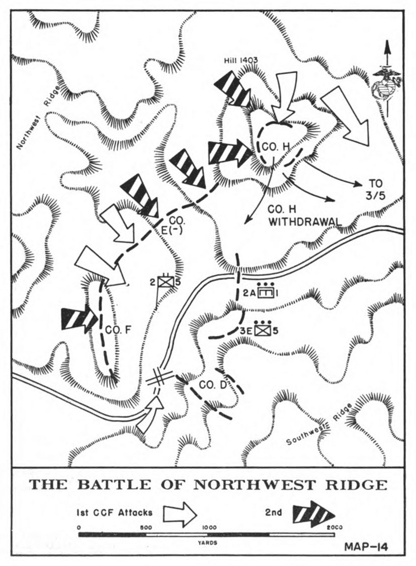 | Marine Attack on 27 November—Marine Disposition Before CCF Attack—The Battle of Northwest Ridge—Chinese Seize Hill 1403—Fighting at 3/5’s CP—The Battle of North Ridge | ||