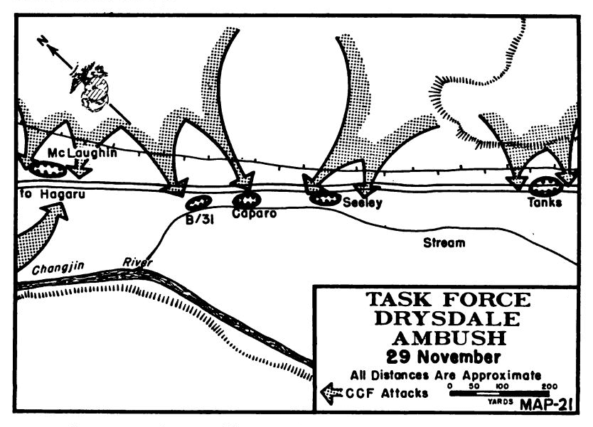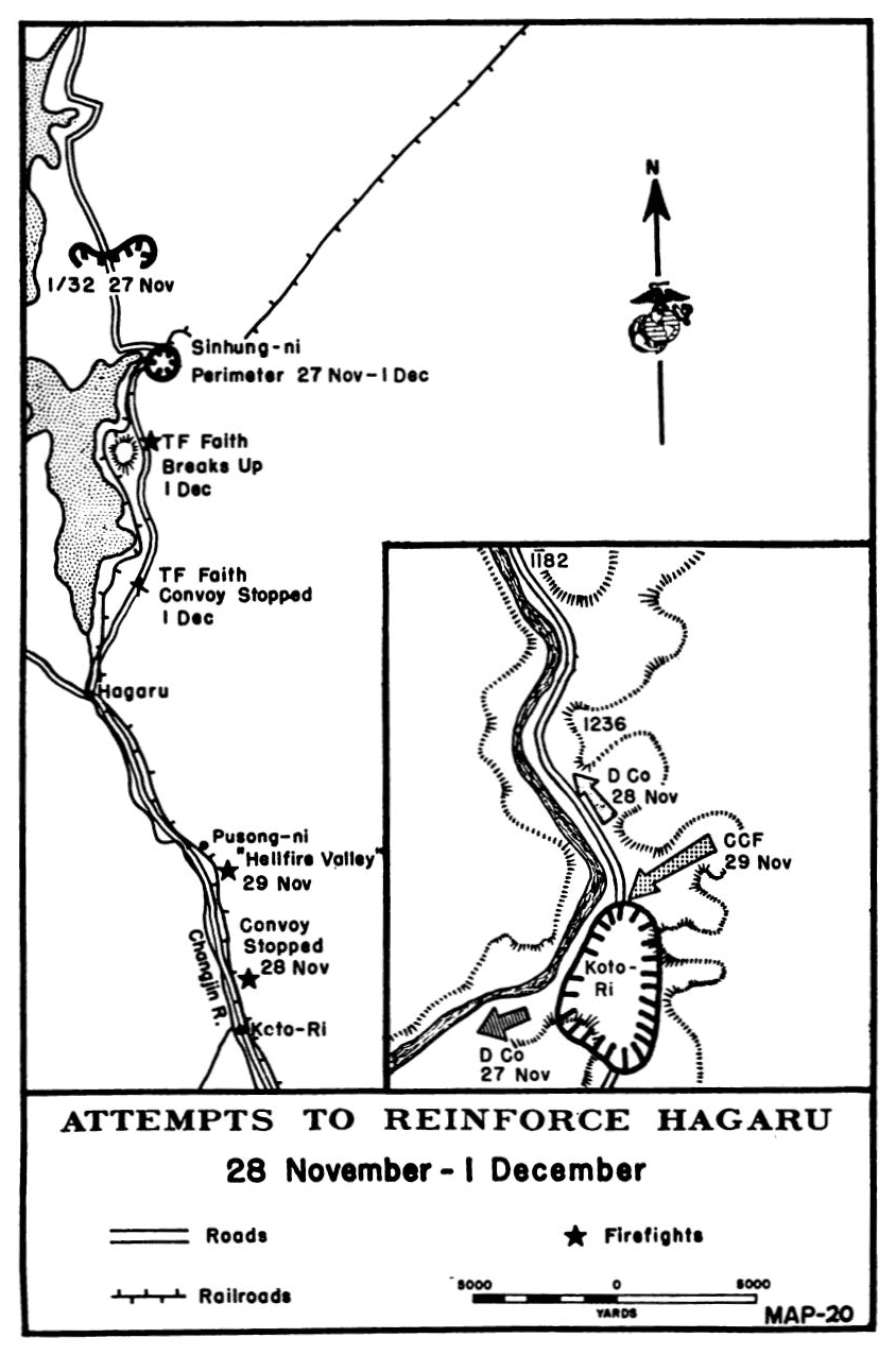| CCF Attacks on 2/1 at Koto-ri—Convoy Reinforced by Marine Tanks—The Fight in Hell Fire Valley—Attack of George Company on East Hill—High Level Command Conference—CCF Attacks of 1 December at Hagaru—Rescue of U. S. Army Wounded—First Landings on Hagaru Airstrip | ||