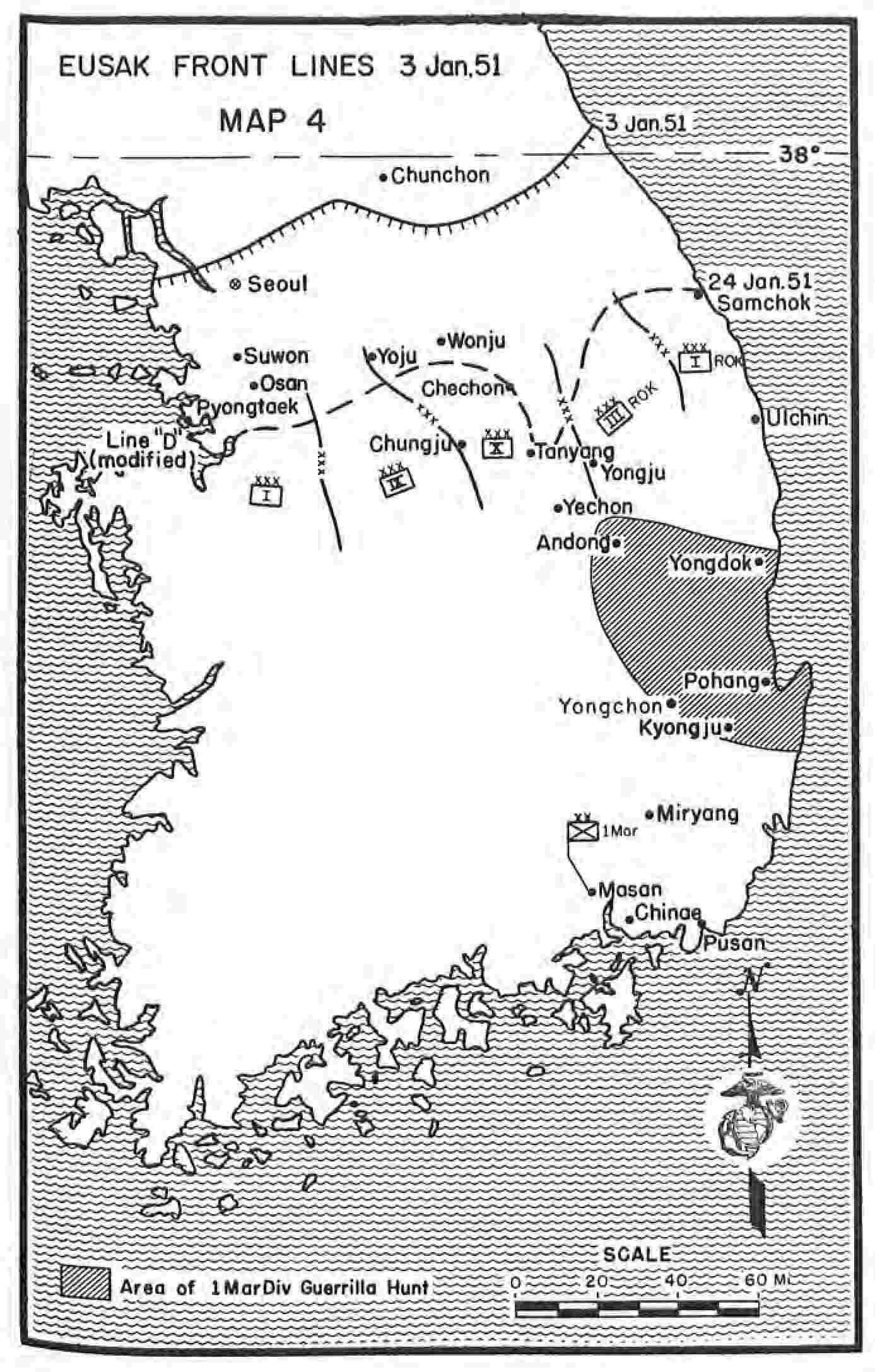 The period covered in this volume begins in the latter part of December 1950, when the Division rested in the Masan “bean patch,” and continues through the guerrilla hunt, the Punchbowl fighting, and all other operations during 1951. The account ends when the Marines move to positions in the west during March 1952.
