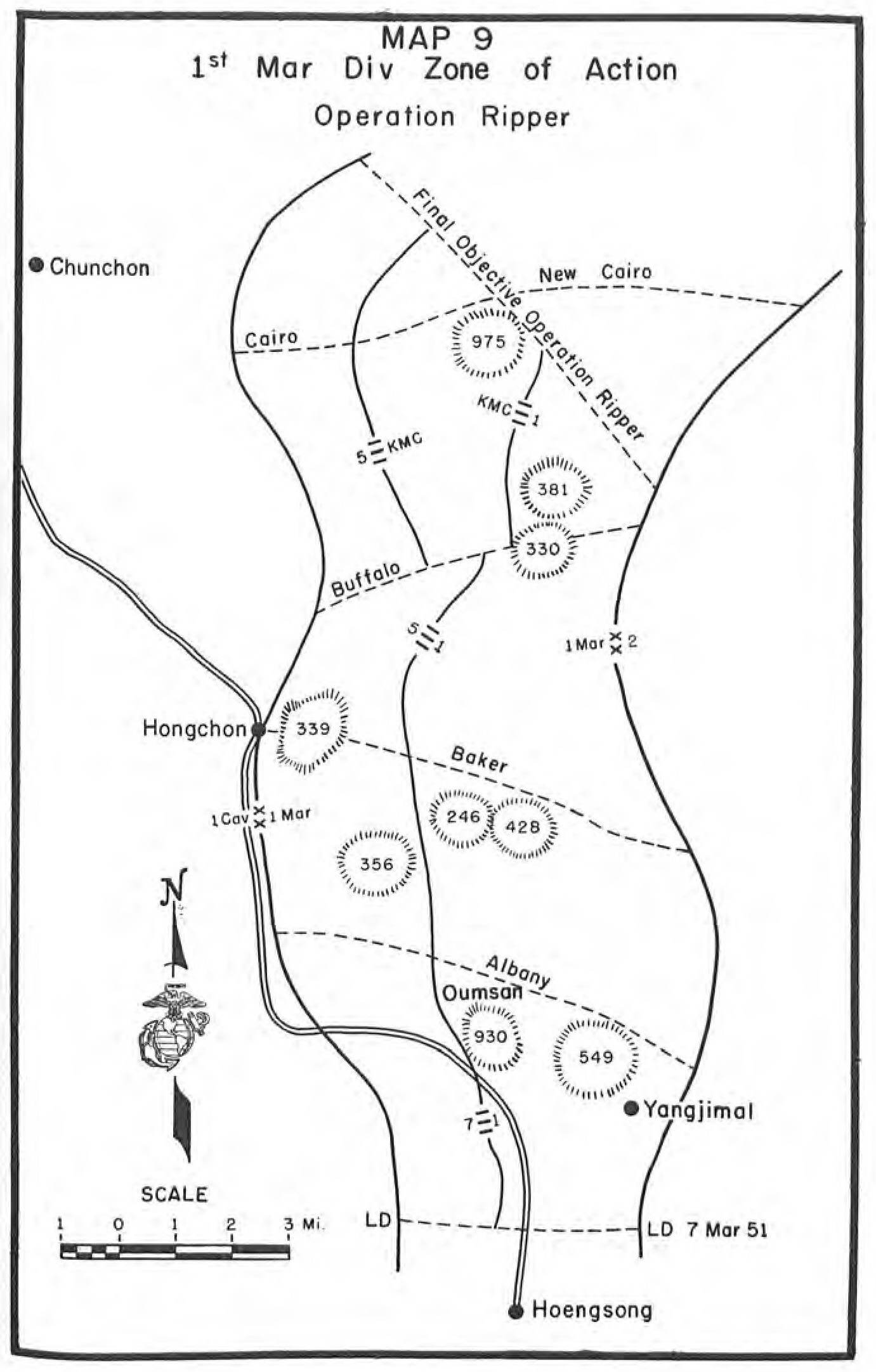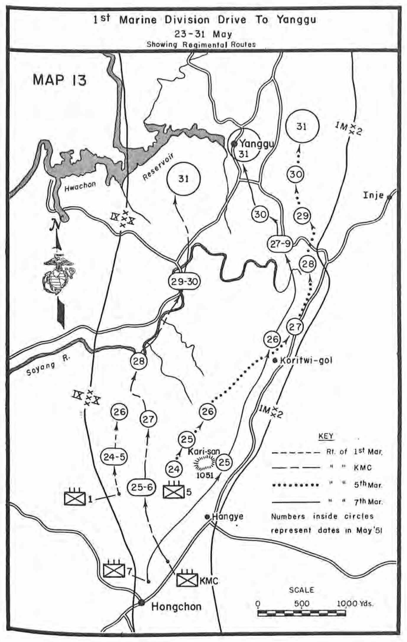 | Crossing the Soyang in Flood—Light Resistance at First—Supply Problems Cause Delay—Resumption of Division Attack—The Mounting Problem of CAS—First Helicopter Supply Operation of History—The Fight for Hill 749—5th Marines Attack Hill 812—The Struggle for the “Rock” | ||