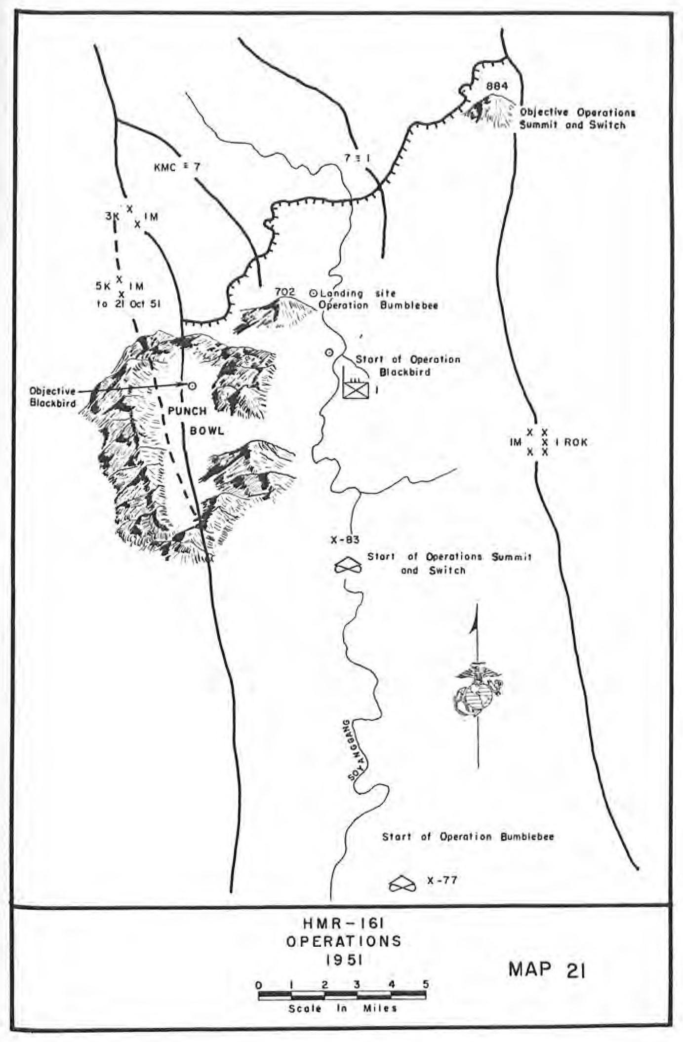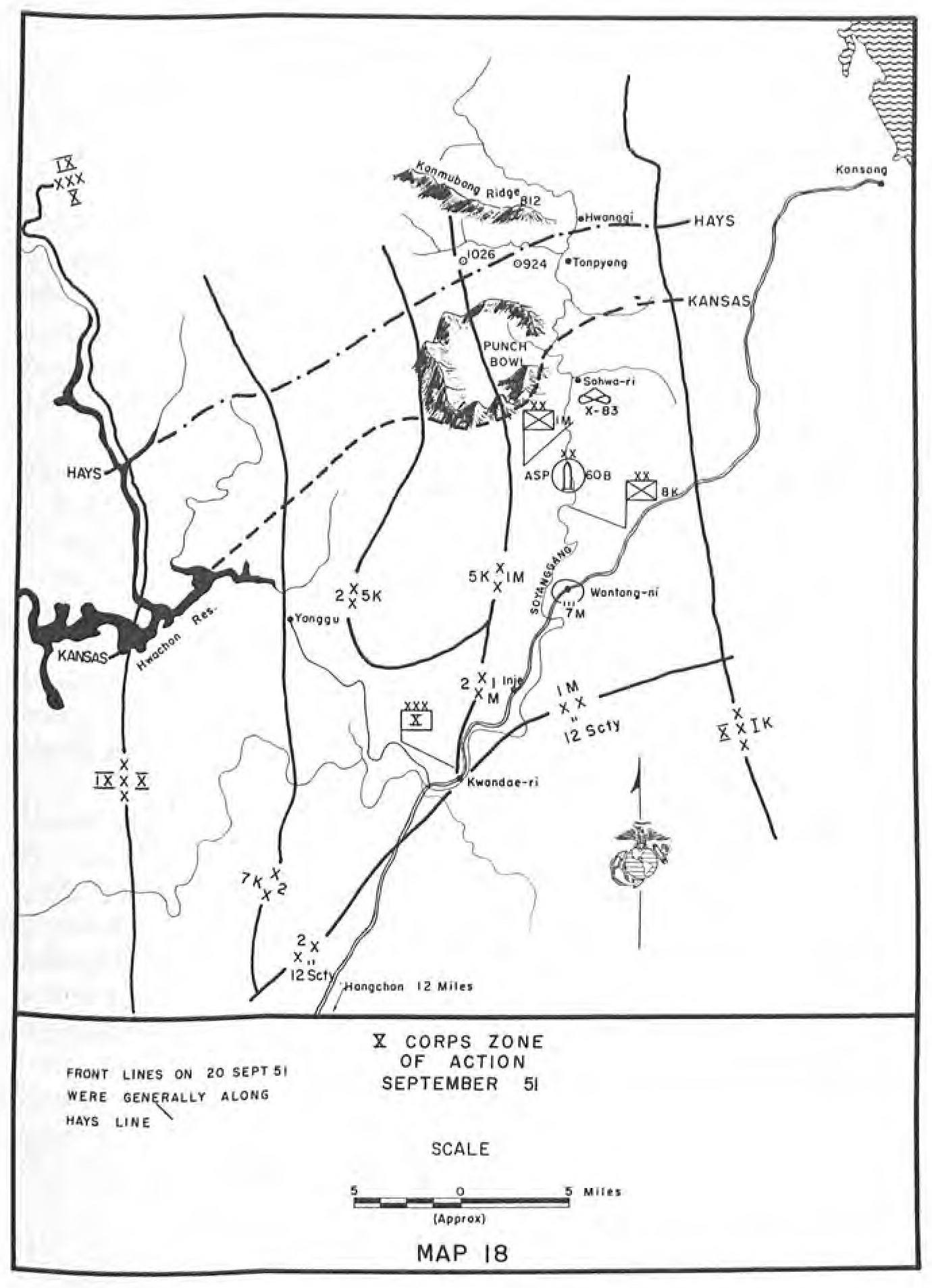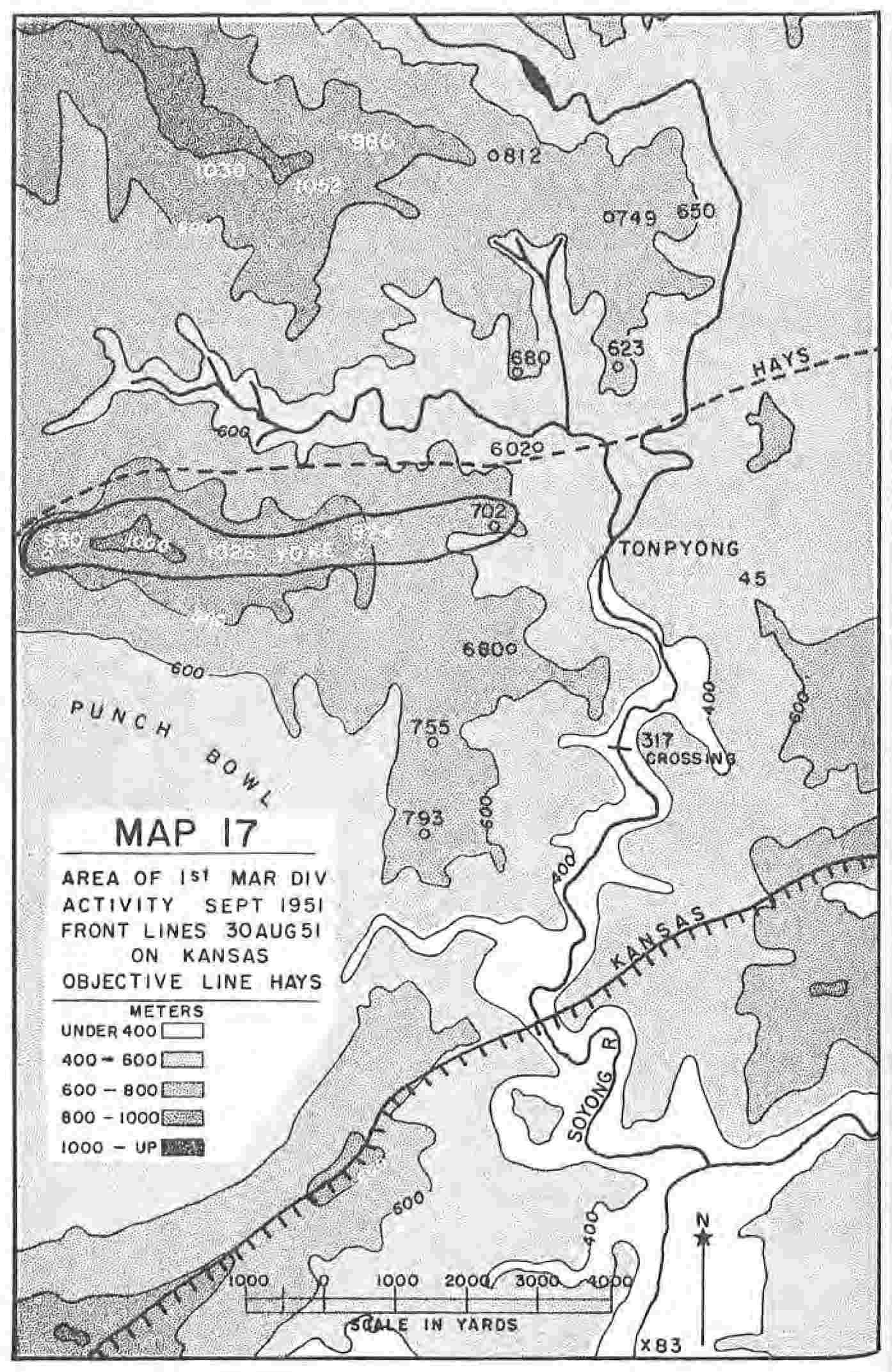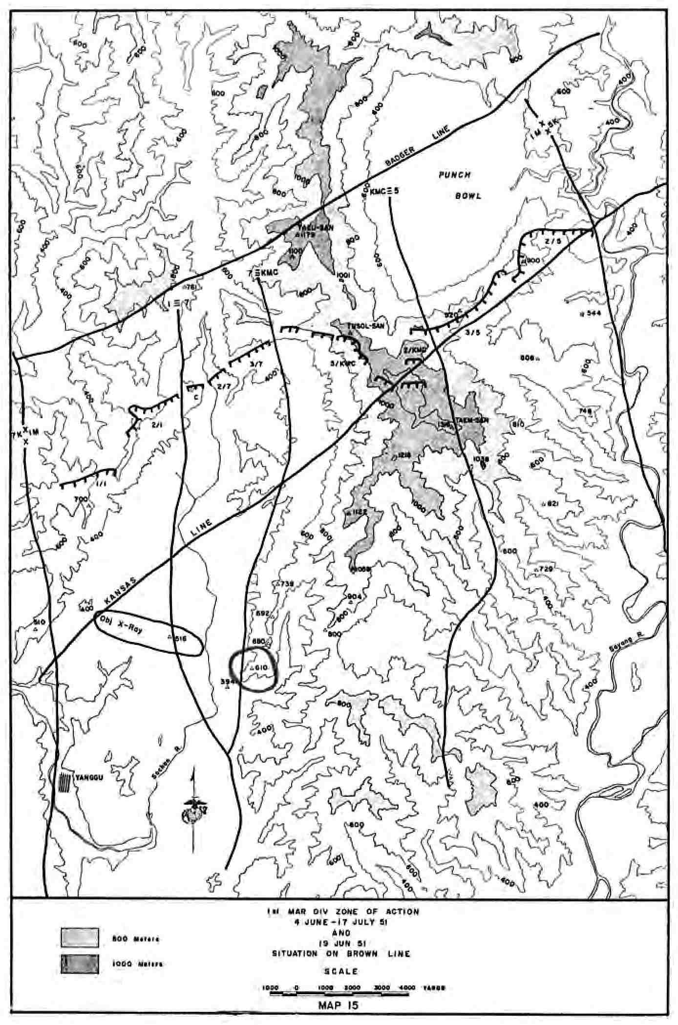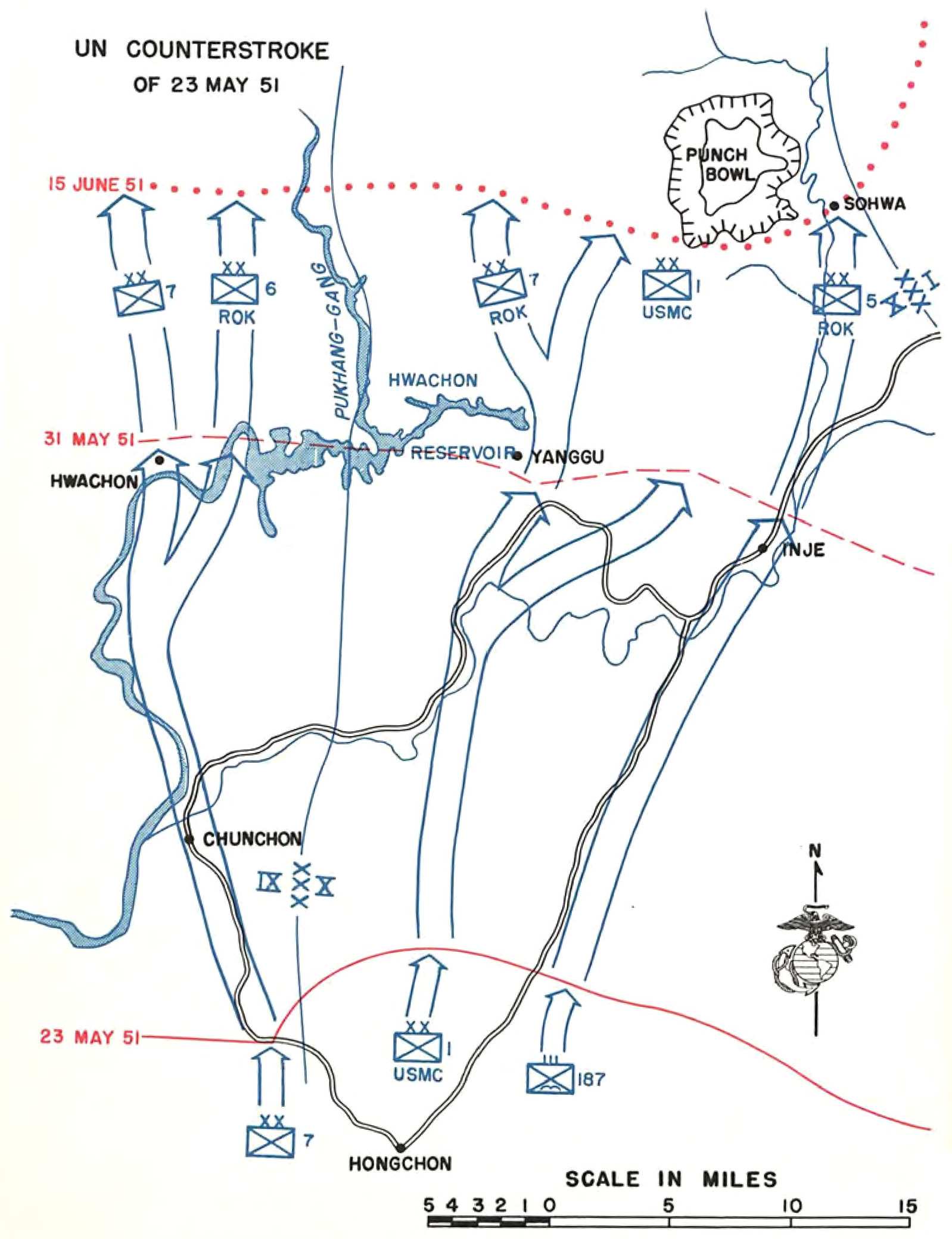 The 1st Marine Division, supported wherever possible by the 1st Marine Aircraft Wing, helped stem the flood of the Chinese offensive in April. Then lashing back in vigorous and successful counterattack, the Marines fought around the Hwachon Reservoir to the mighty fastness of the Punchbowl. The Punchbowl became familiar terrain to Marines during the summer of 1951, and the Division suffered its heaviest casualties of the year fighting in the vicinity of that aptly named circular depression.