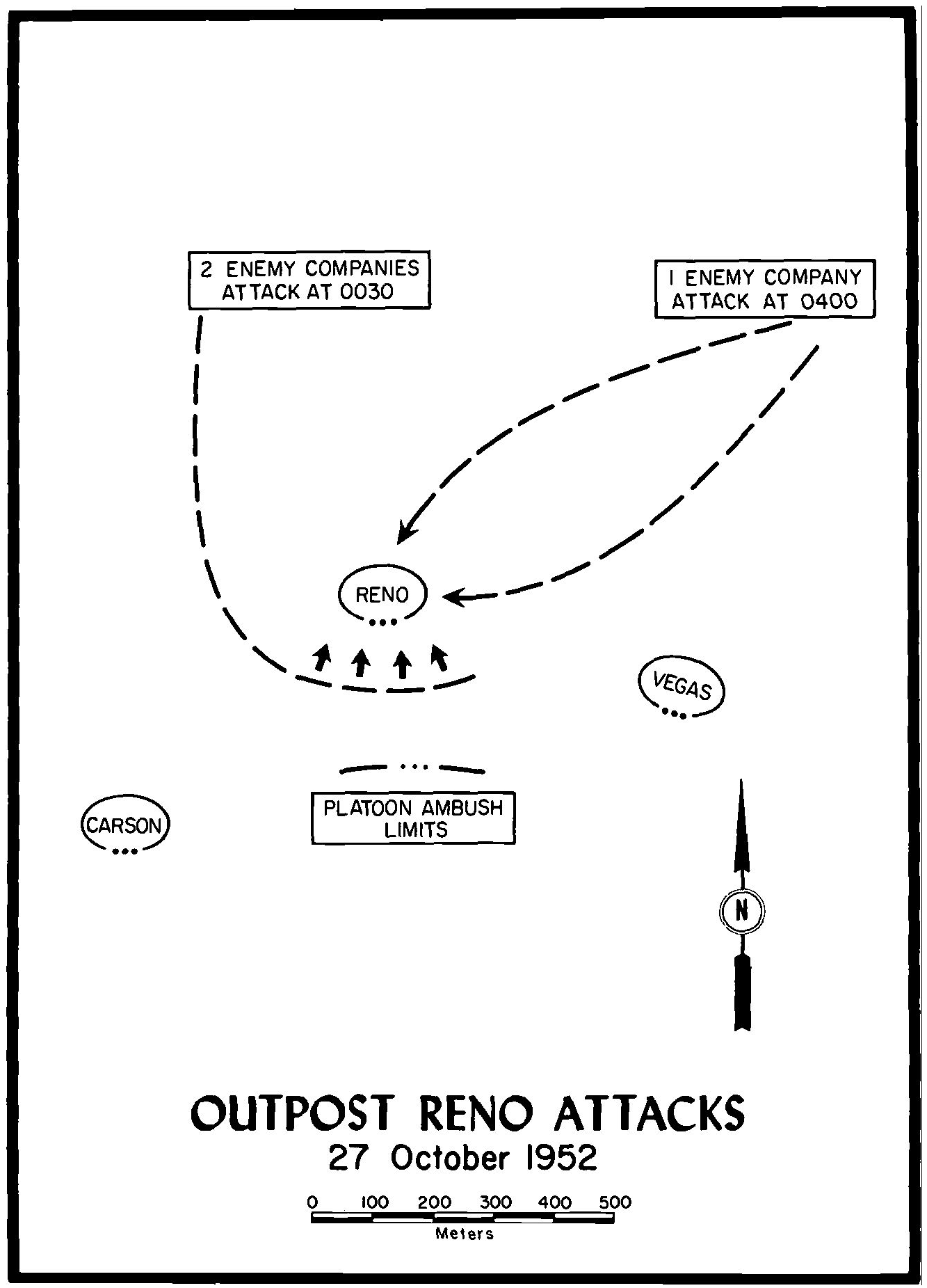 | The Nevada Cities—Supporting Arms—Defense Organization at the Outposts—Chinese Attack on 26 March—Reinforcements Dispatched—Massed Counterattack the Next Day—Push to the Summit—Other Communist Probes—Three CCF Attempts for the Outpost—Vegas Consolidation Begins—Aftermath | ||