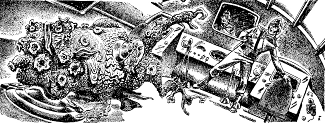 He crouched against the instrument panel and drew his disinteray. Fighting down the sick, panic that swelled in his throat, he fired, time after time, into the undulating, pulpy mass on the floor. The impact had no visible effect. Still he could see it growing ... spilling with soft, slobbery noises across the ship toward him.